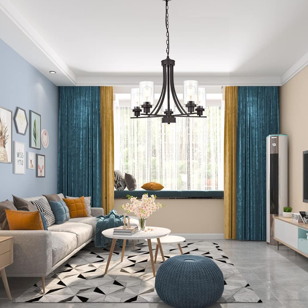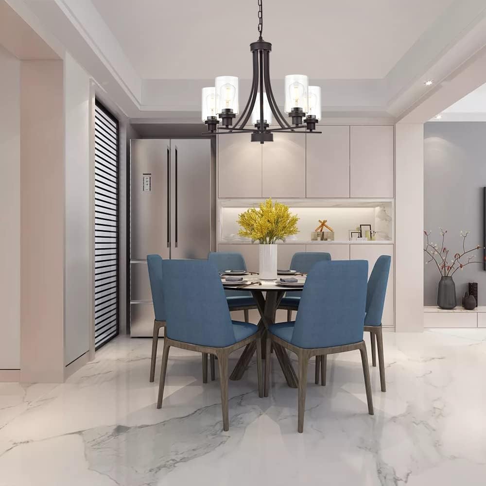 - π 5 Light Glass Chandelier: This contemporary chandelier with high clear glass shadesοΌit is an elegant update for traditional and modern homes alike.It's the perfect light fixture to install in kitchen, island, dining room,living room,foyers ,hallway,bedroom,coffee bar, lobby, restaurant and any space you like.