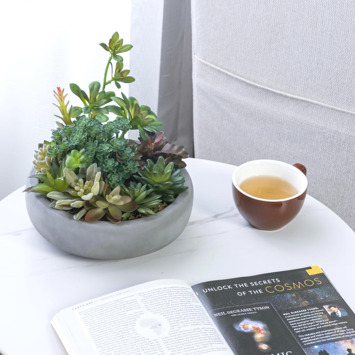 - Assorted artificial succulent plants in a gray cement planter pot complements modern decors