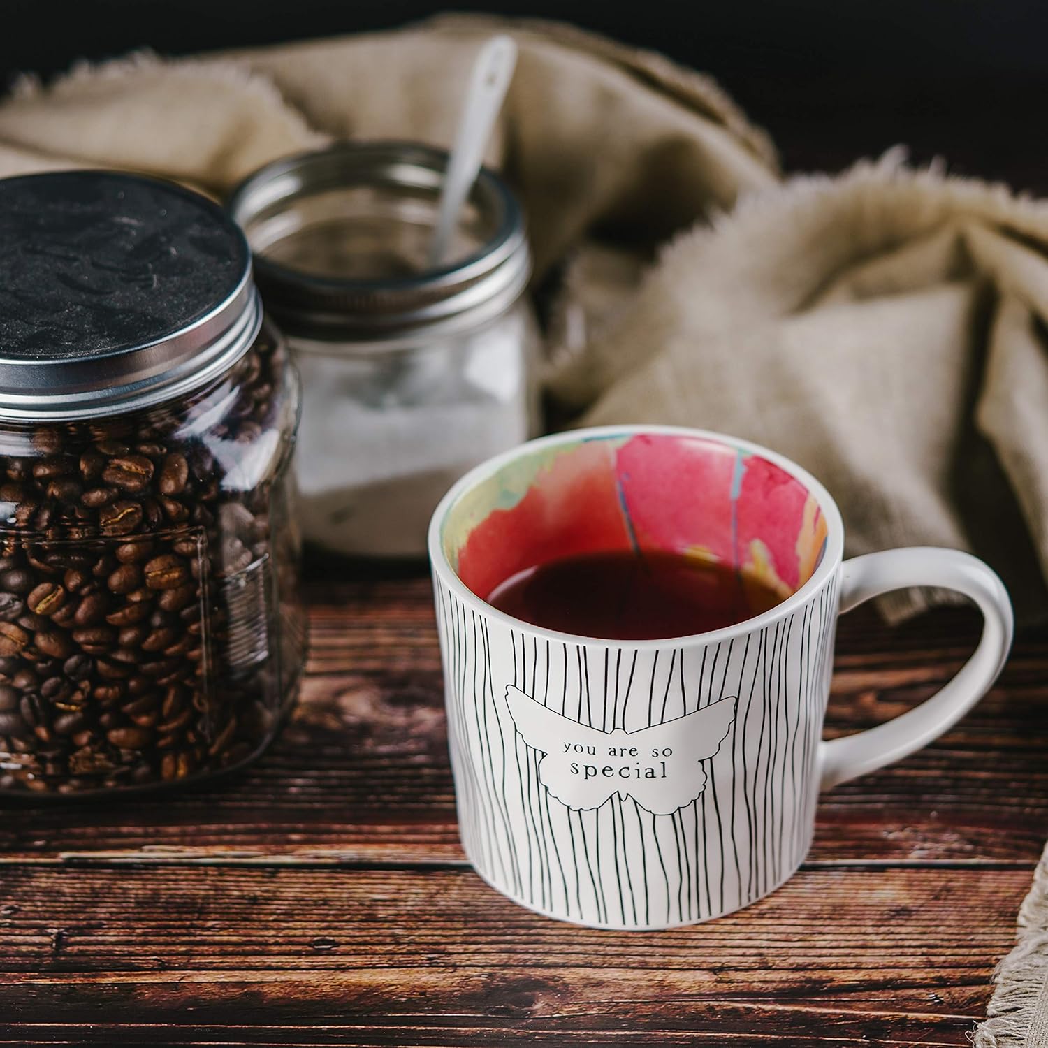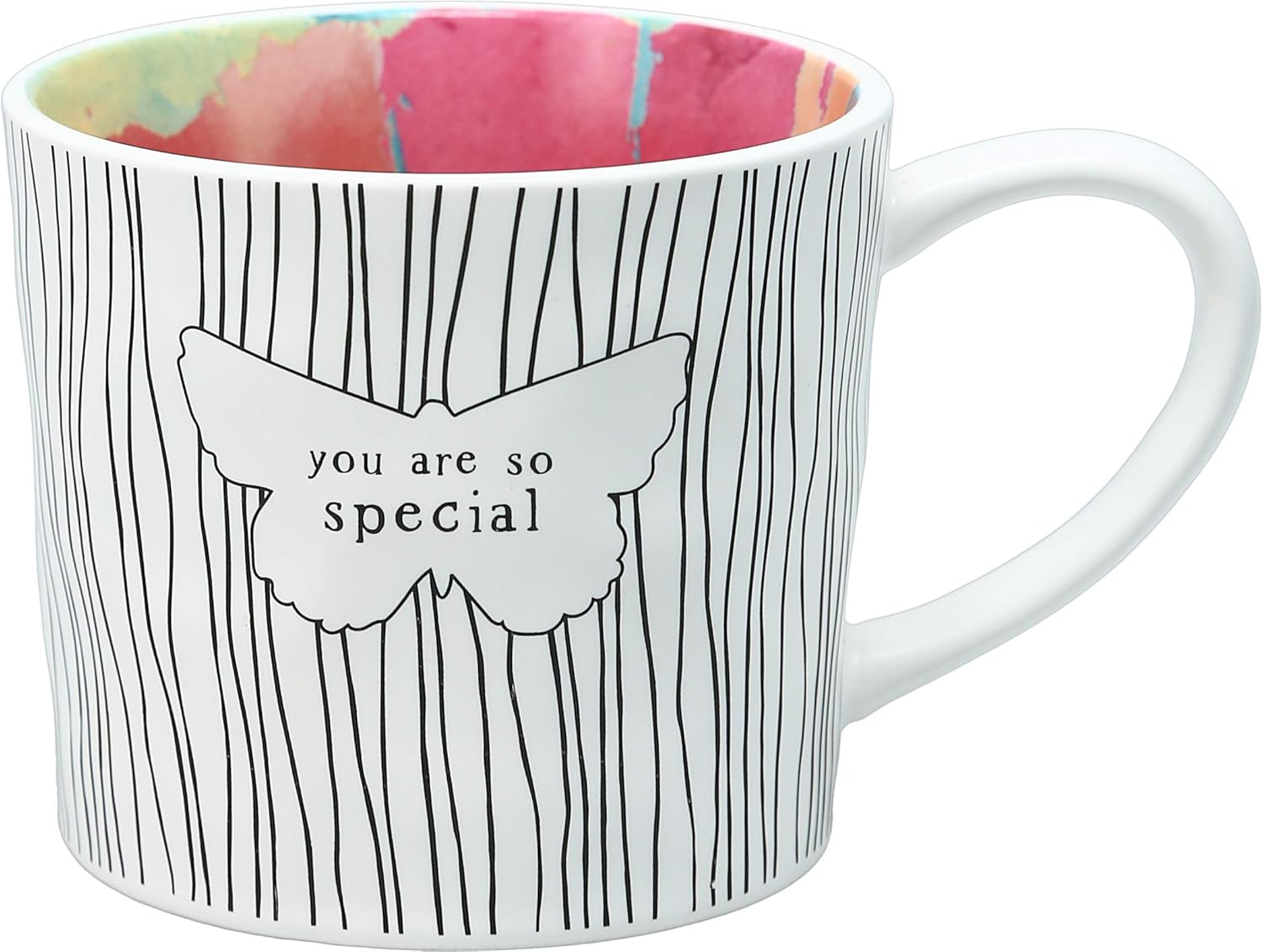 - IN-HOUSE DESIGN: "You Are So Special" text, debossed butterfly detail, and stripe decal are applied to the exterior of the mug, while the interior features a color splash pattern.