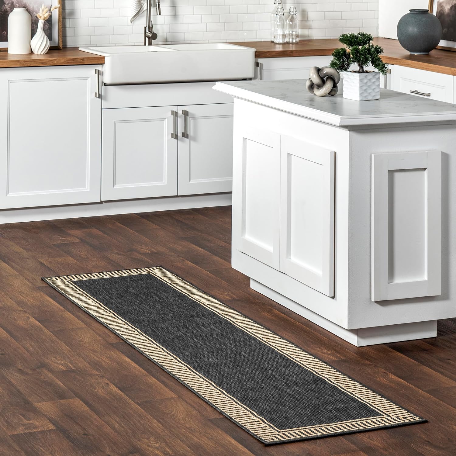 nuLOOM 2' x 8' Outdoor Area Rug, Casual Design With Striped Border, Stain Resistant, Highly Durable, For Patio, Balcony, Bedroom, Living Room, Dining Room, Bathroom, Dark Grey