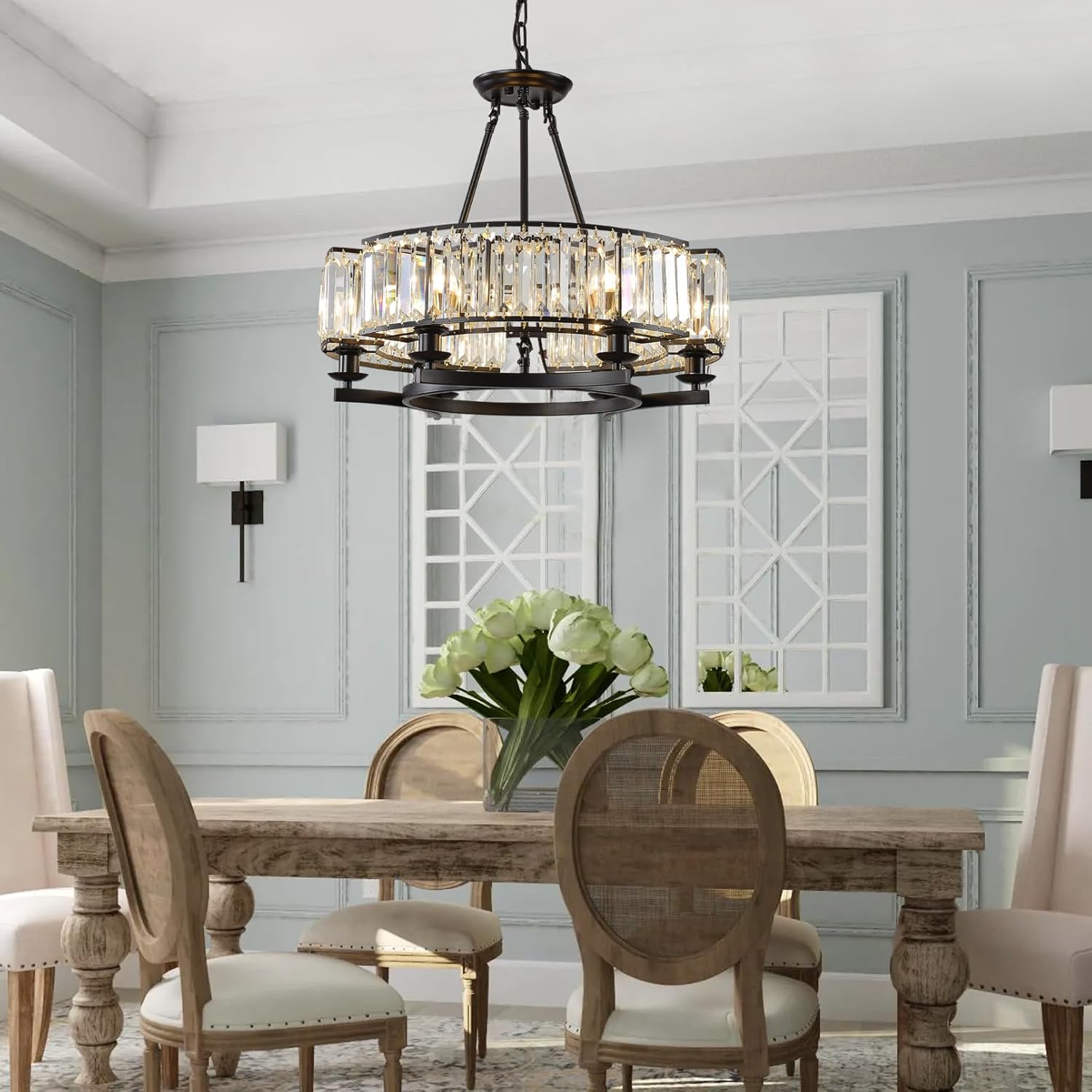 - Retro and Luxury Design: This round modern rustic crystal chandelier combines of black metals and raindrop K9 clear crystal creating a rustic yet luxurious retro atmosphere. The lamp frame of this round chandelier is oil rubbed, which is anti-corrosive and rust-proof, durable, and easy to clean. Ideal for villa/restaurant/living room/dining room.