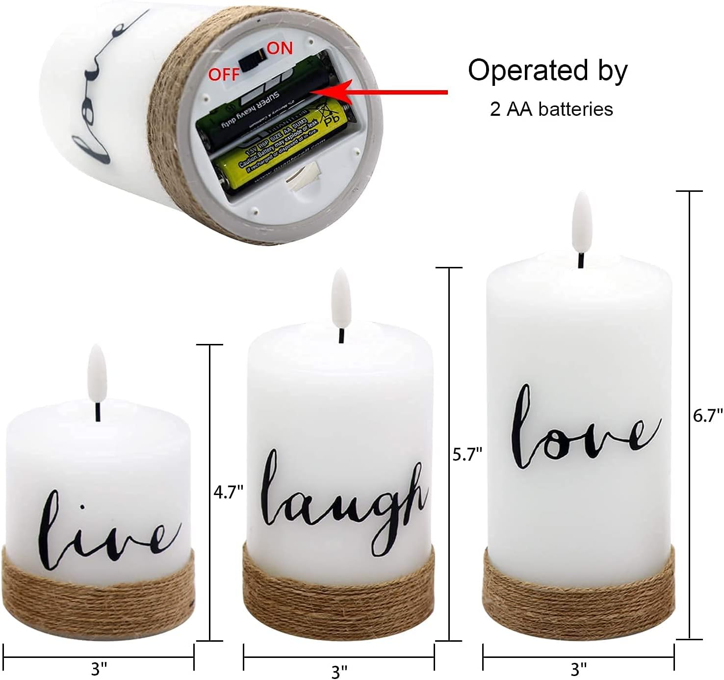 - Live Laugh Love: Each candle is 3 inch wide and 4.7”, 5.7” and 6.7” tall, requires 2 type AA batteries (not included) and are made of highest quality wax.