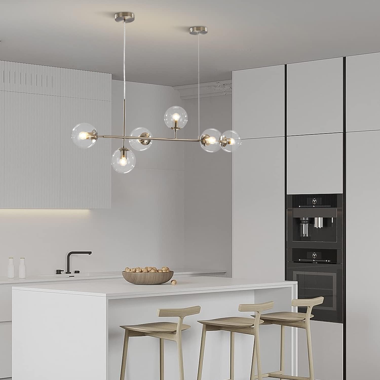 - Classic Globe Design: The brushed nickel kitchen island pendant lighting crafted from metal in a painted chrome finish, features with 6 clear glass globe shades. Simple line structure shape, parallel and vertical lines match to reflect a full three-dimensional sense, with a strong artistic tone, enjoy the geometric aesthetics of lines