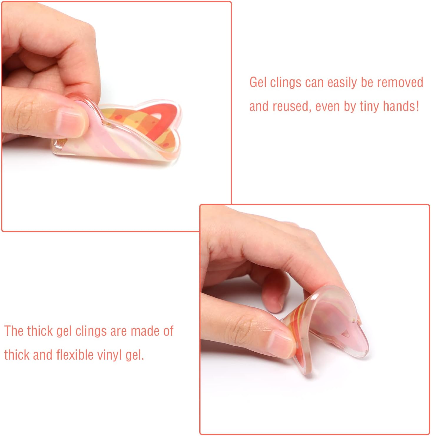 - Easy to use: just peel off the outer space thick gel clings from the plastic backing, then place it on any surface you want; if you want to rearrange it, just tear it off and move it.
