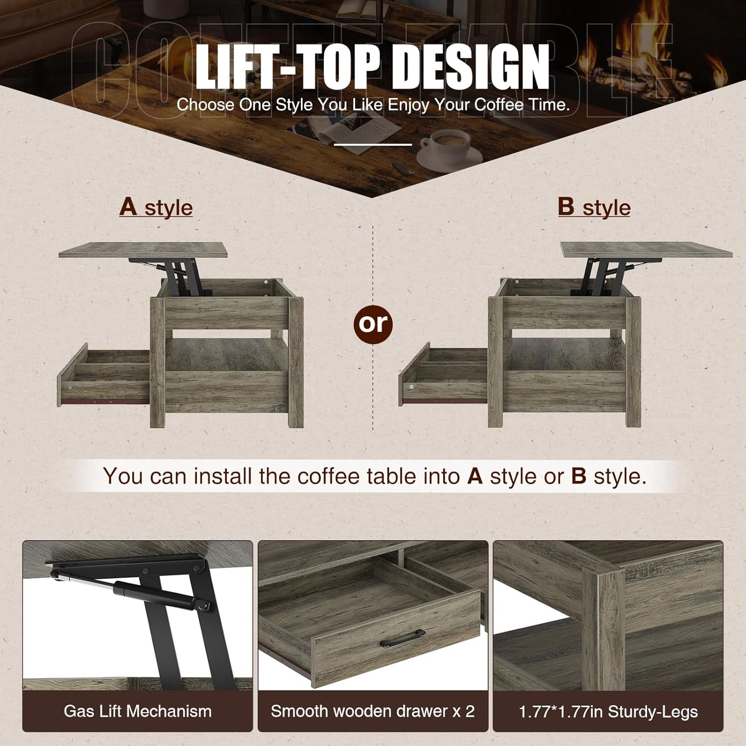 Rolanstar Coffee Table, 47.2" Lift Top Coffee Table with Drawers and Hidden Compartment, Retro Central Table with Wooden Lift Tabletop, for Living Room, Washed Oak