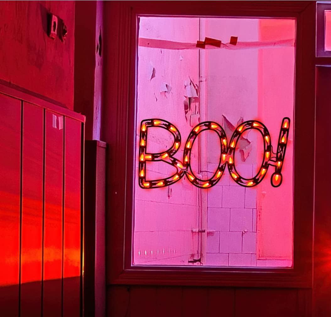 - BOO Halloween Window Silhouette Decoration: 35 mini lights BOO Light measures 16 x 7.5 -Inch; 2 pcs replacement bulbs,2 flasher bulb, 2pcs spare fuses,2 pcs zip ties and 1 pc suction cup included.