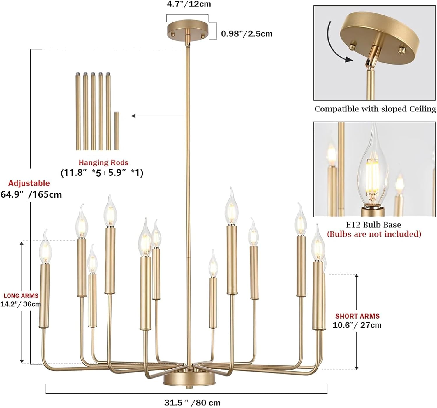 - Modern Fashion Design: A classy candelabra chandelier with different lengths of arms and black matte finish which allows you to clean easily. The appearance of 12 uneven arms look genuine and novel. The whole minimalist design is classic but not rigid. With this simple and retro look can upgrade your space that is elegant but generous