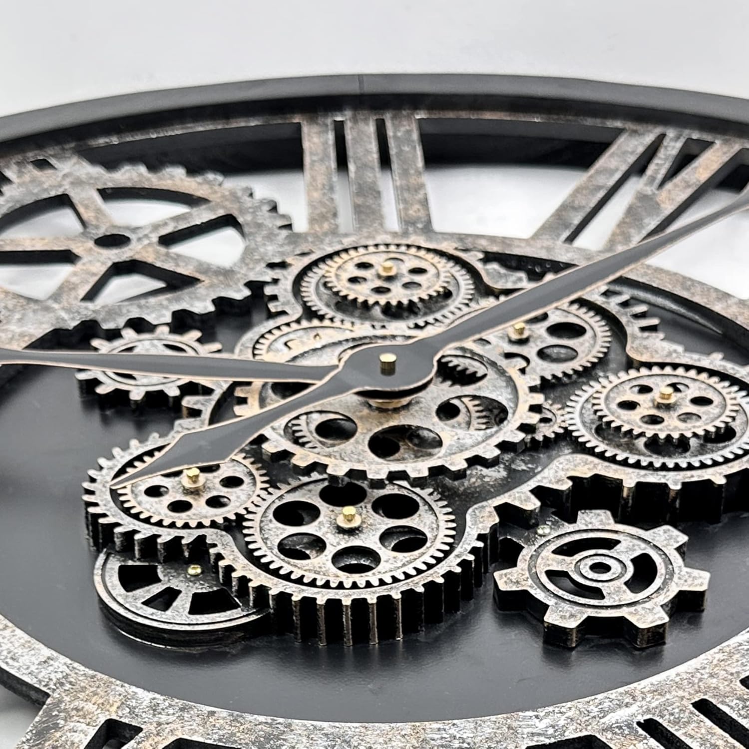 - ăReal Moving Gear ClockăAll gears for the wall clock are real moving! Design with rustic bronze-color and industrial style. An creative combination of four gears for a retro look, has a very exquisite decorative effect makes the wall clock become a chic art works. The large wall clock crafted of nature wood & MDF. Big roman numeral numbers and wood rustic moving gears perfect for any room decor.