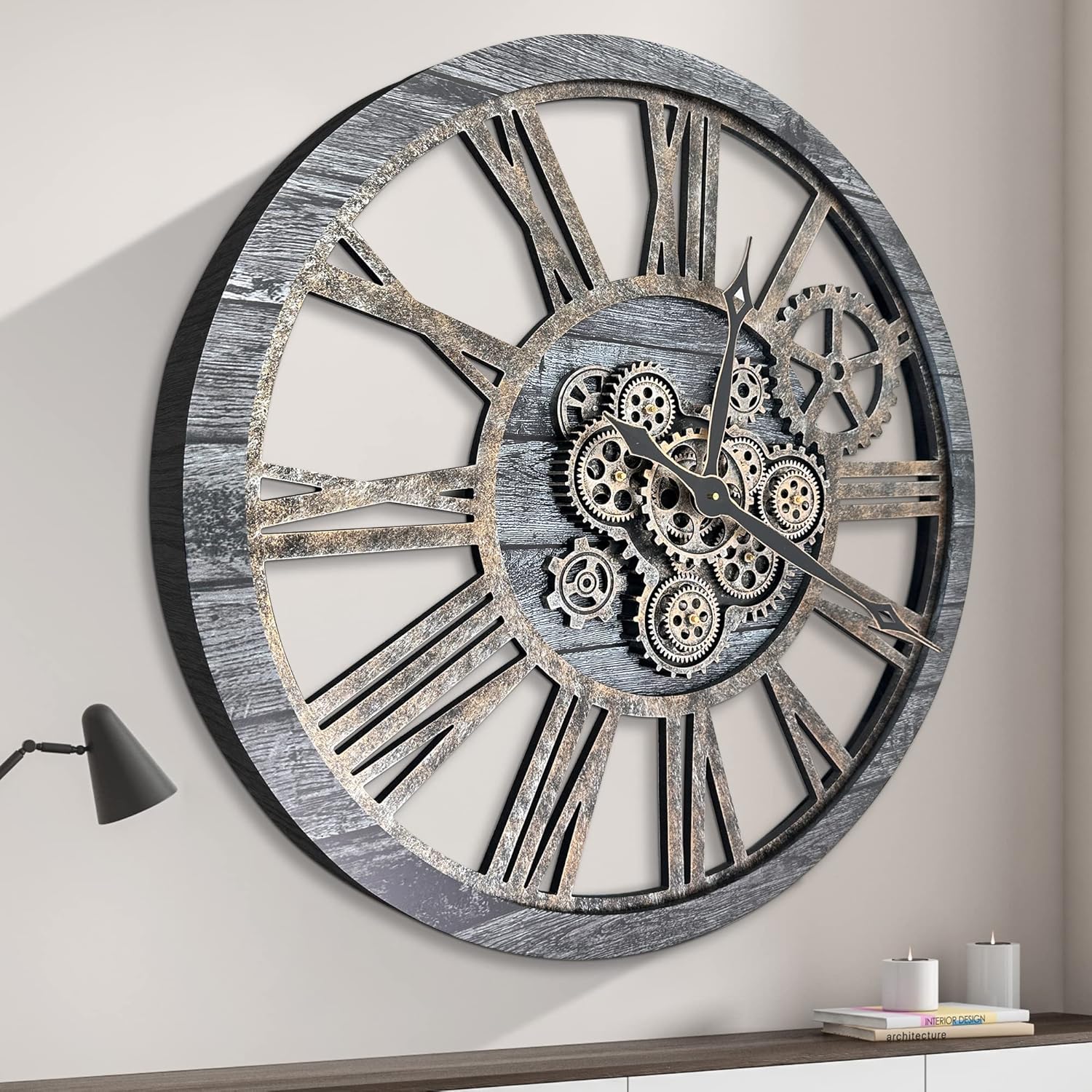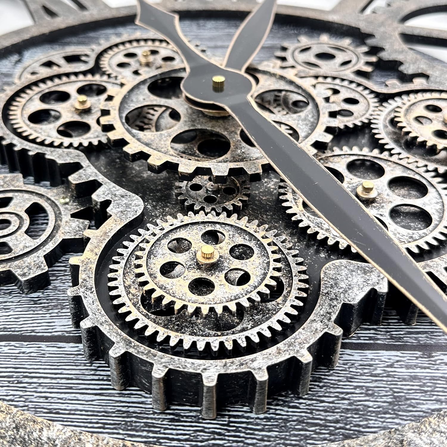 - ăReal Moving Gear ClockăAll gears for the wall clock are real moving! Design with rustic bronze-color and industrial style. An creative combination of four gears for a retro look, has a very exquisite decorative effect makes the wall clock become a chic art works. The large wall clock crafted of nature wood & MDF. Big roman numeral numbers and wood rustic moving gears perfect for any room decor.