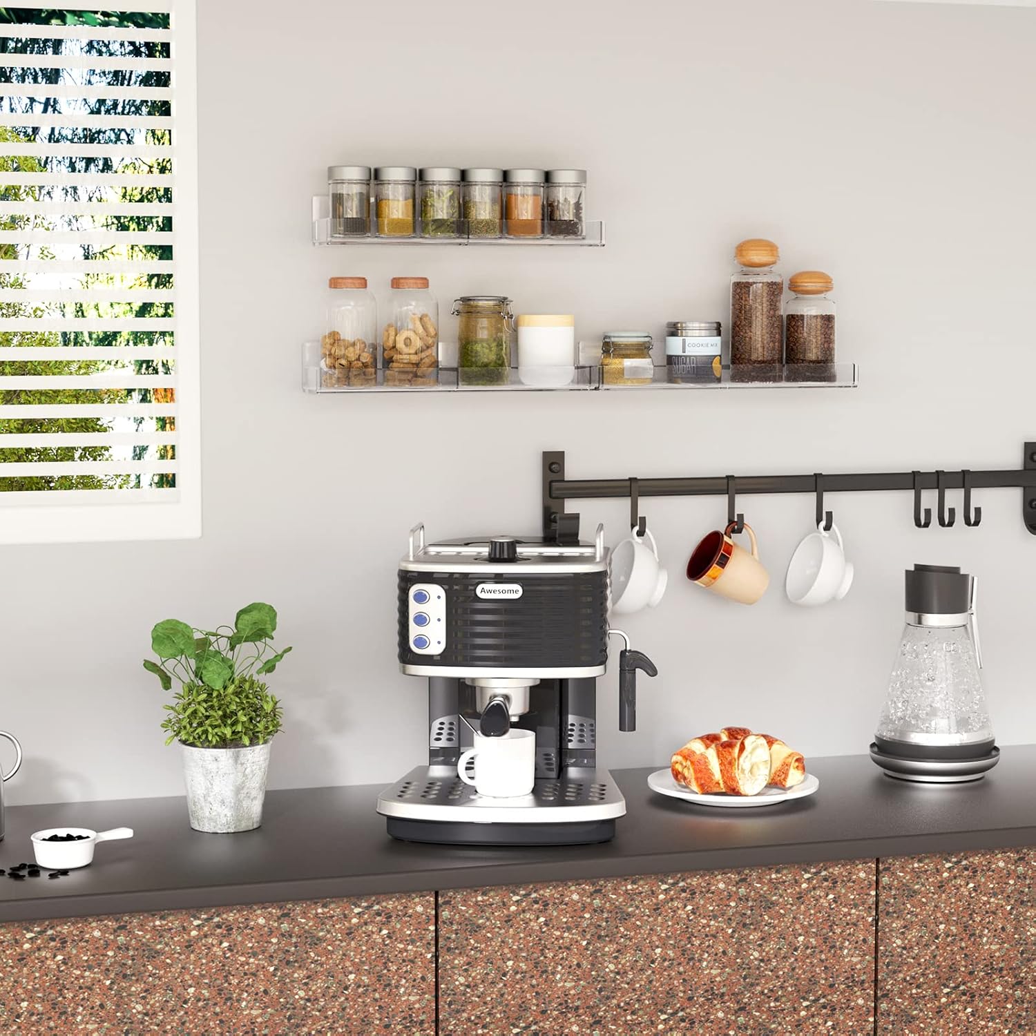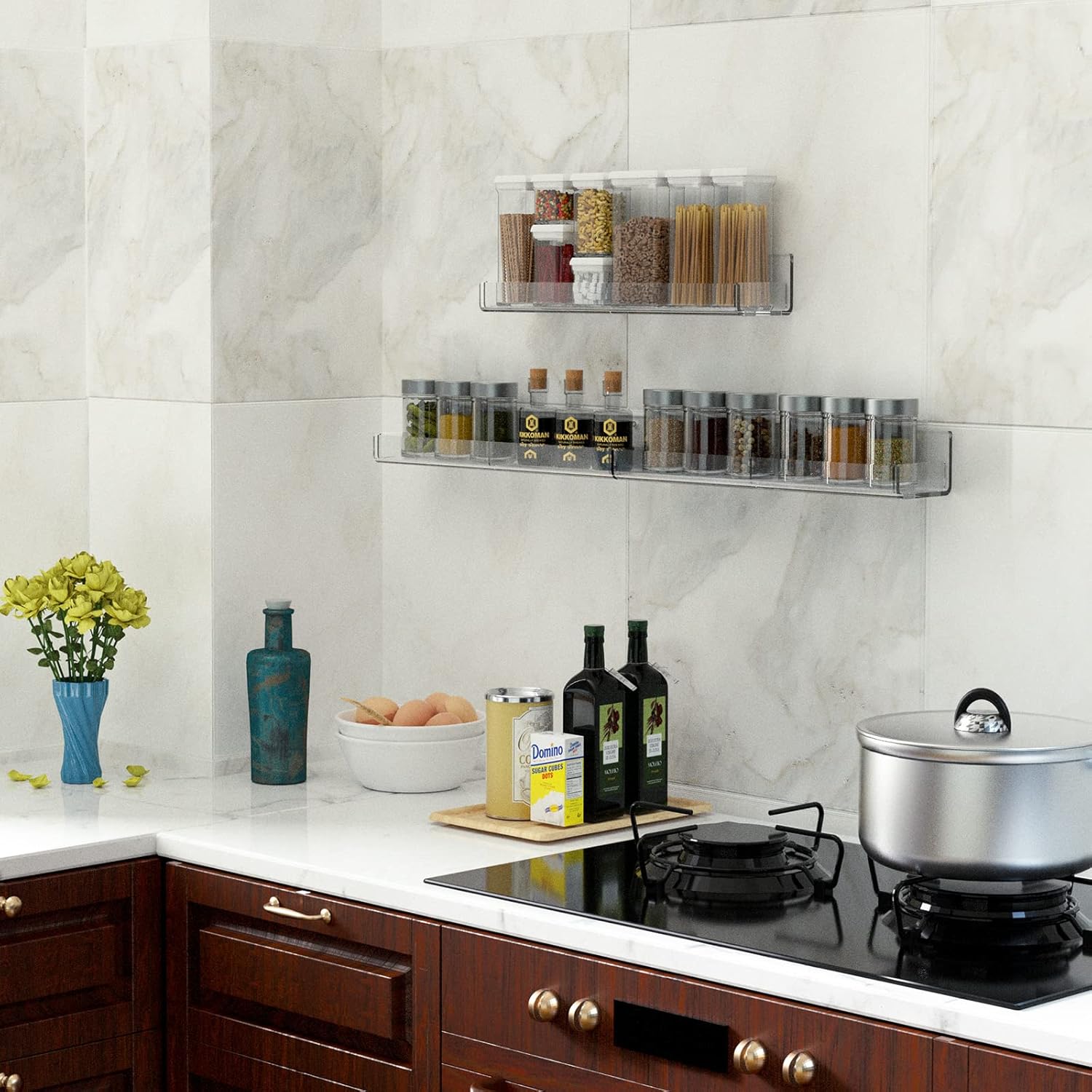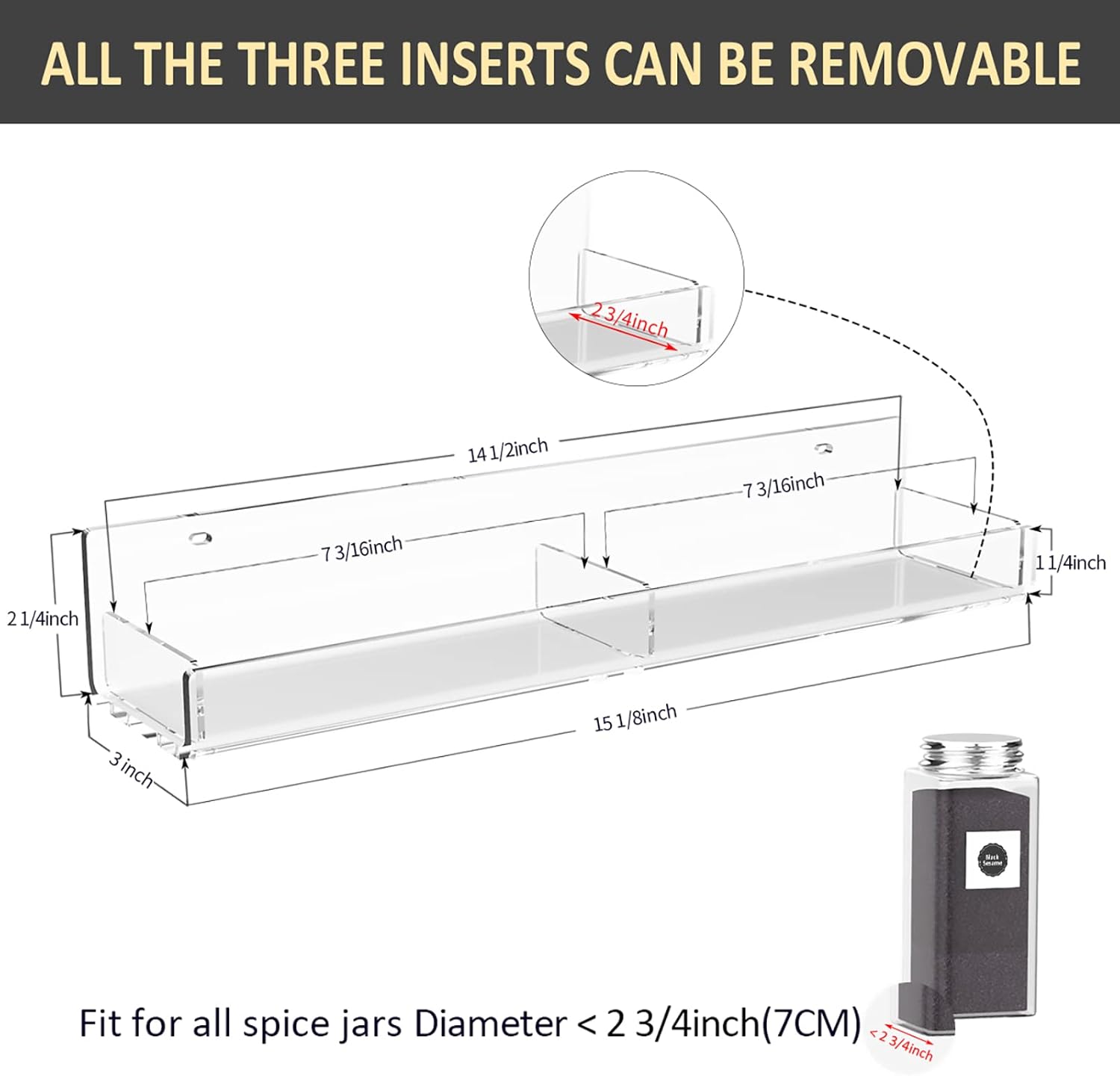 - Unique Design: 4mm super clear acrylic material. The spice racks would be very sturdy and can hold up to 15Lbs. The wall mount spice racks offer clear side inserts to prevent your spice jars from falling off. We also offer an extra insert for each acrylic shelf. You can insert it in the rack middle to be a divider to distinguish different spice jars. Square one or round one. The racks are all seperated that you can adjust the distance according to your jars' height.