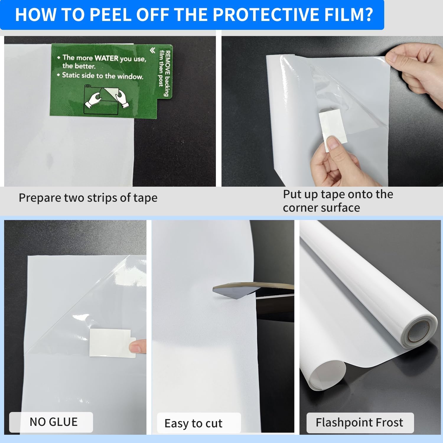 - [Installation Tips]: Please make sure that the surface, edges and corners of the window are clean enough without any dust, and remember to remove the transparent back film before installation; During installation, spray plenty of water on the surface of the window and on the back of the window privacy film to ensure effective adhesion! Note: Not for use with frosted, cut or machined glass that does not have a smooth surface
