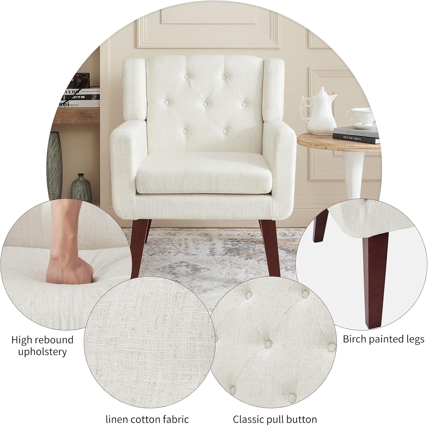 Accent Chair Button-Tufted Upholstered Living Room Chairs Comfy Reading Chair Mid Century Modern Chair with Linen Fabric Lounge Arm Chairs for Living Room Bedroom (Beige Set of 2)