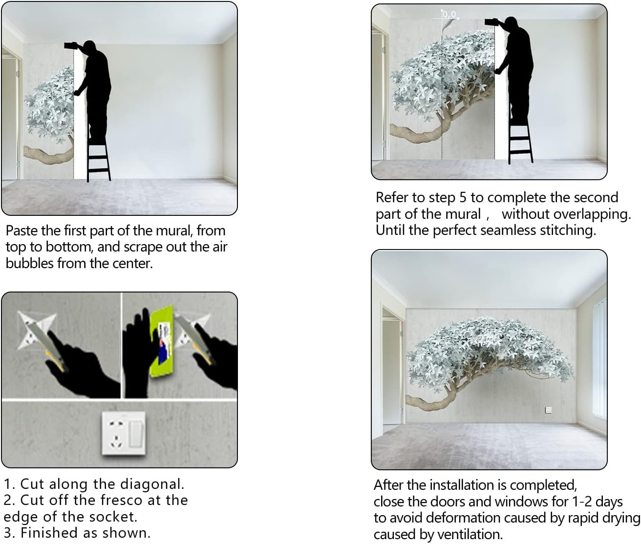 - It's easy to install: at the bottom of each mural we have a numbered sequence, You can refer to the instructions we provided and the main picture 6-7,just match the numbers and you'll be amazed!