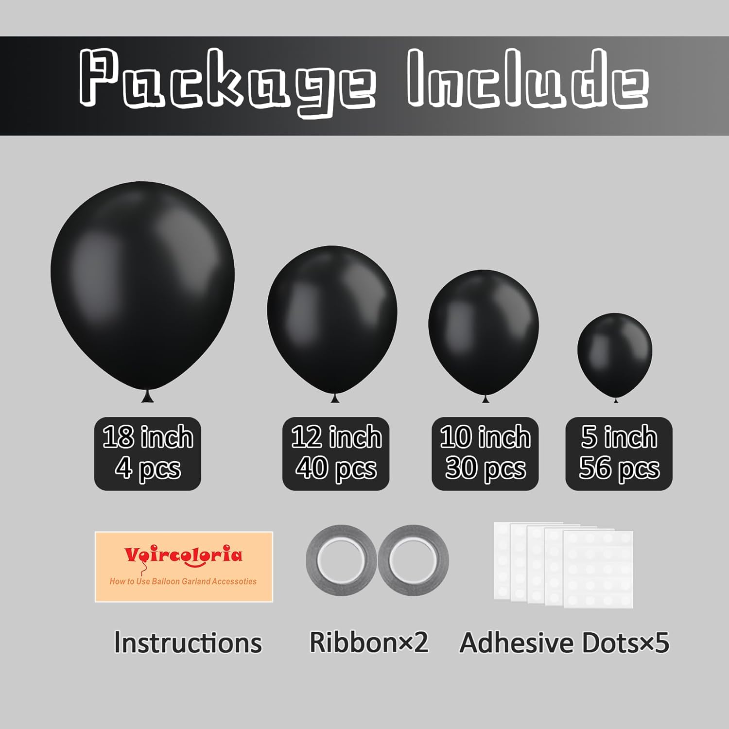 - 130pcs Black Balloons Set: The package includes 56pcs 5inch, 30pcs 10inch, 40pcs 12inch, 4pcs 18inch, 1 roll of ribbon, 1 roll of adhesive dots(100pcs), 1pcs balloon decorating strip. 5"+10"+12"+18" different sizes of black balloon garland kit fully meet your party needs and make your balloon garland kit look more layered