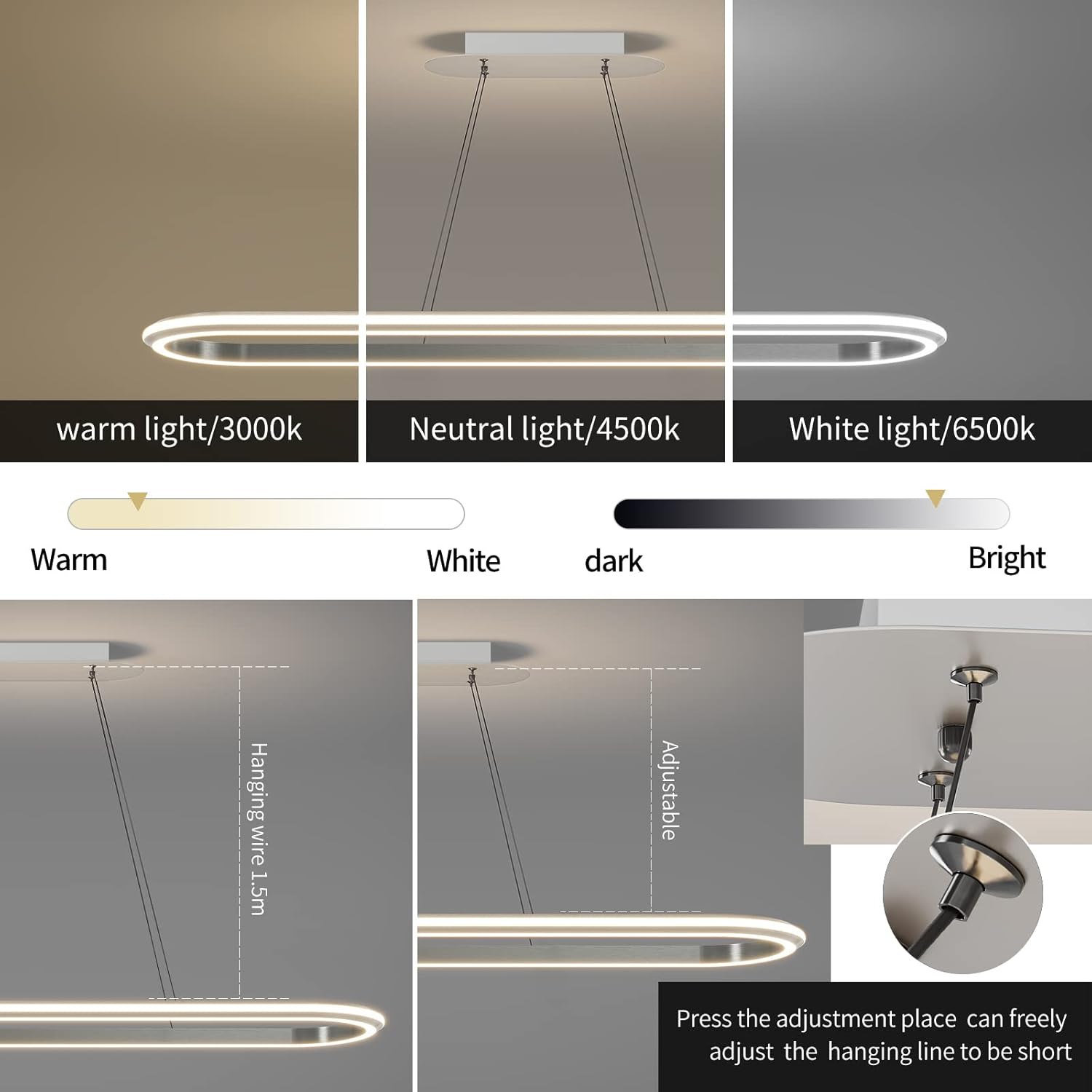 - Multiple Shapes :This linear dining light has 2 adjustable wires, simply press the black button connecting the wires to the shade to adjust the height, perfectly adapting to the height of the ceiling to meet your various needs.