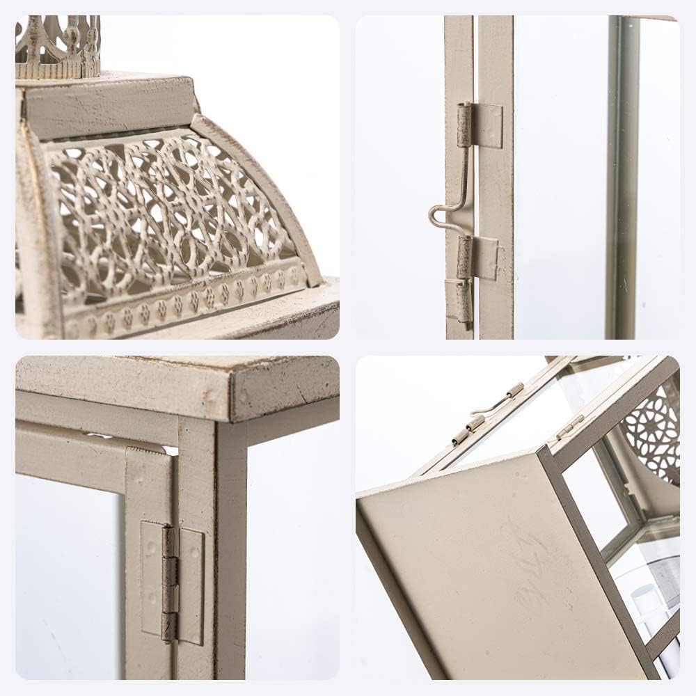 - 【Sturdy Build】This white christmas lantern is made from supreme quality wrought iron, strong metal frames distressed by brush powdering for weather-resistant use. The lanterns decorative outdoor with four tempered glass panes greatly reduces the damage of glass when decorative lantern from external changes and protect the flame from drafts. Place a candle(up to 4" dia) inside the lantern to illuminate your space in a soft and dreamy glow. Measures 5.5"Wx5.5"Wx14.4"H.