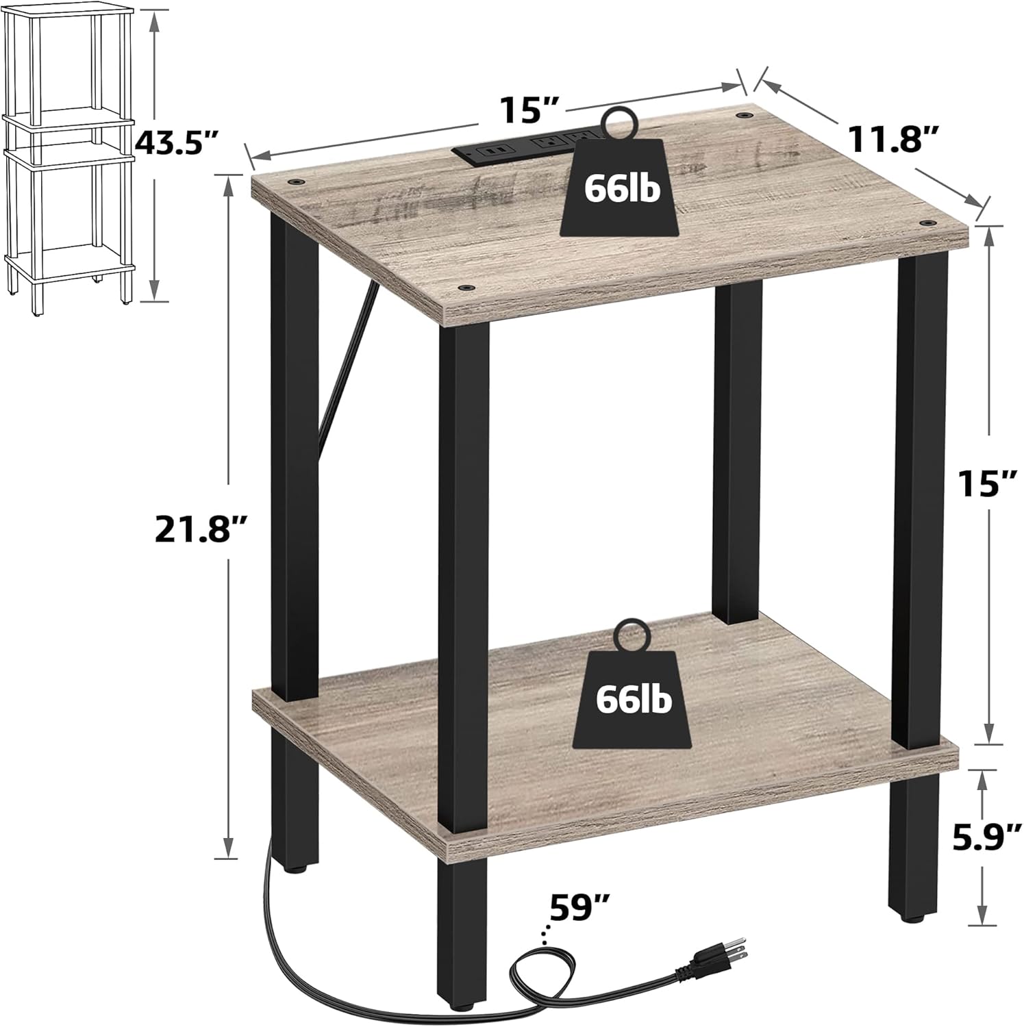 - [End Table with Charging Station] This side table with 2 AC outlets, 2 USB ports, and the 4.5 ft extension cord helps you charge your phone, tablet, lamp, and game console at the same time. Also, the distance between each outlet and port prevents adapters from blocking each other.