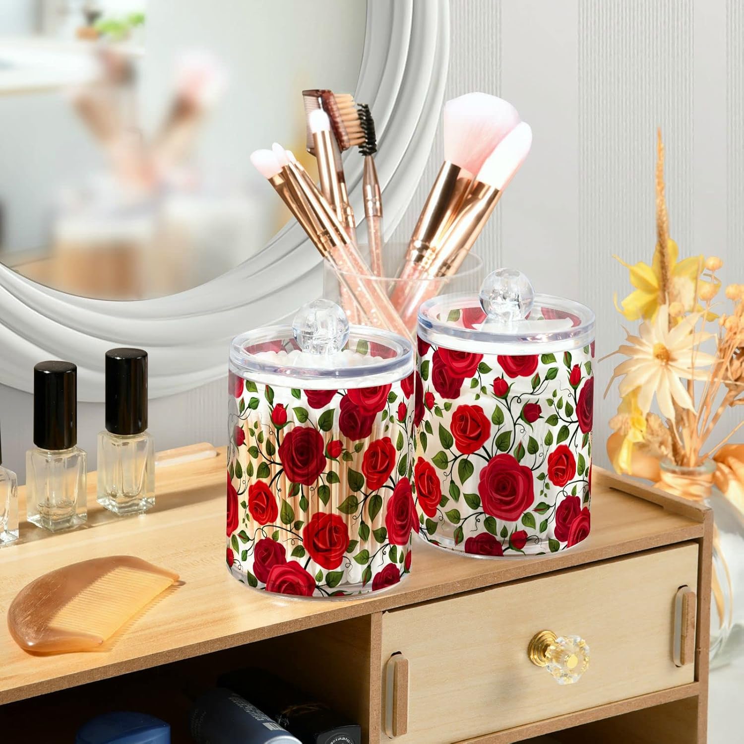 2 Pack Qtip Holder Dispenser Red Rose Flowers Bathroom Storage Canister Lid Acrylic Plastic Apothecary Jar Set Vanity Makeup Organizer for Cotton Swab/Ball/Round Pads, Floss