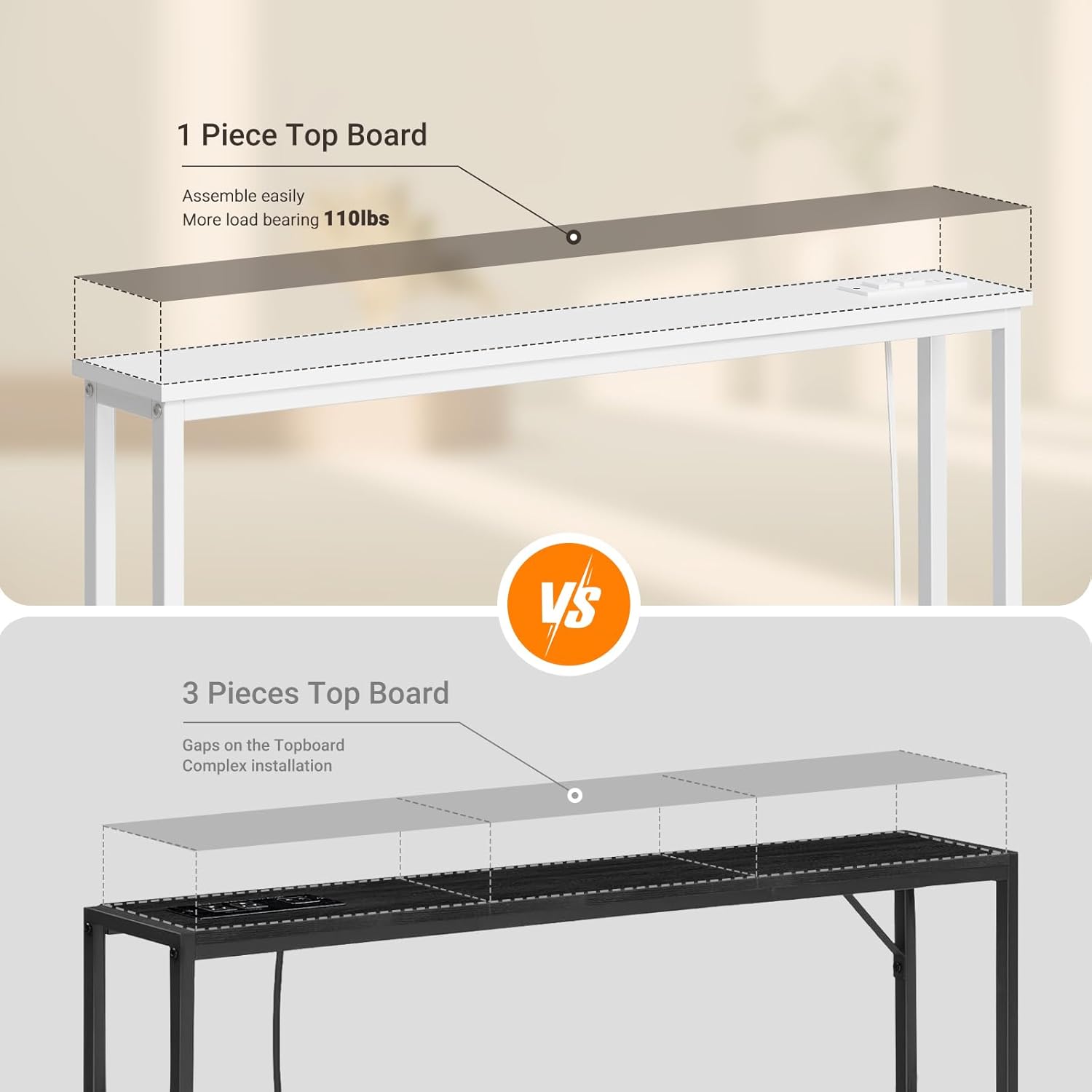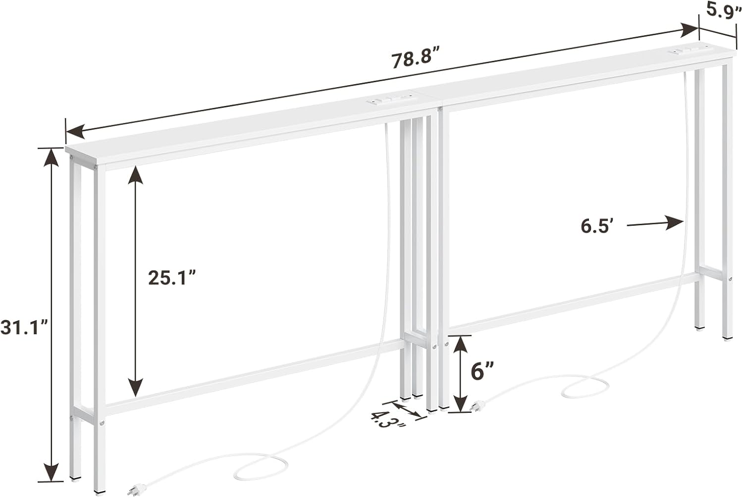 - Back Sofa Table with Outlets: The narrow long table with 2 standard 120VAC outlets, 2 USB ports and 6.5 feet long power cord to rescue the socket behind the sofa to charge the laptop/mobile phone