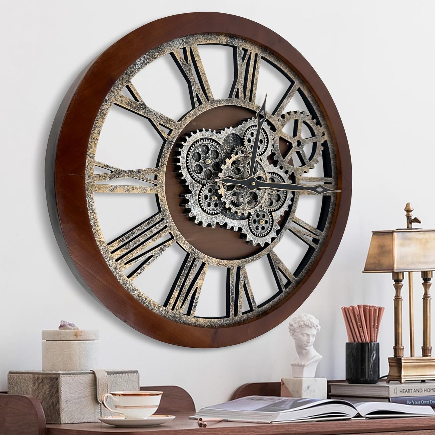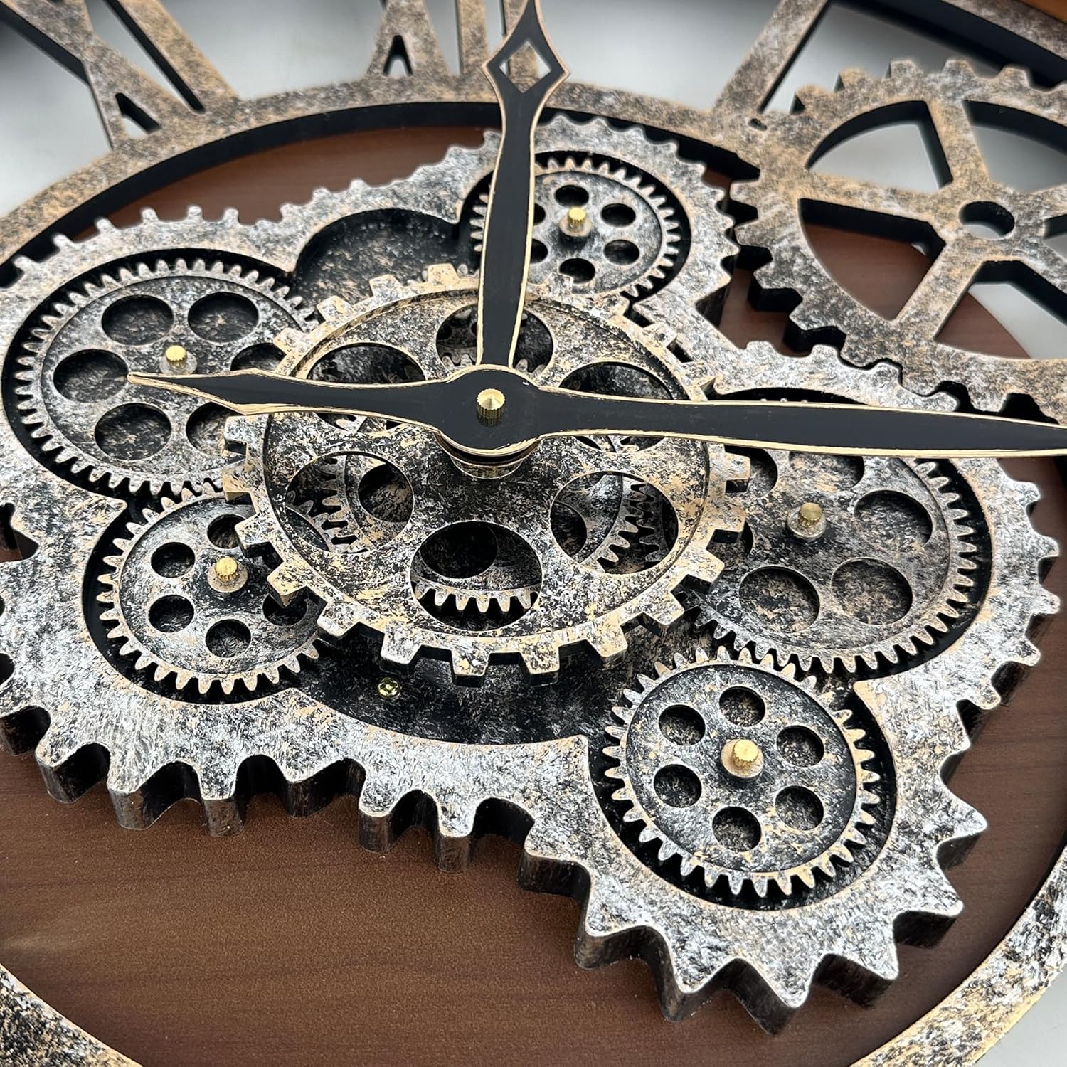 - ăReal Moving Gear ClockăAll gears for the wall clock are real moving! Design with rustic bronze-color and industrial style. An creative combination of four gears for a retro look, has a very exquisite decorative effect makes the wall clock become a chic art works. The large wall clock crafted of nature wood & MDF. Big roman numeral numbers and wood rustic moving gears perfect for any room decor.