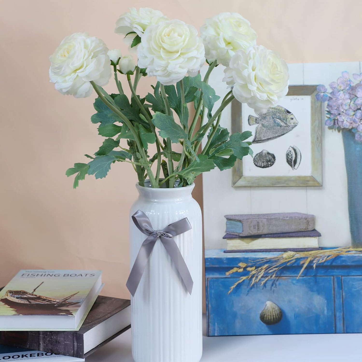- Beautiful Flowers:This set includes six white ranunculus artificial flowers,designed with intricate details and distinctive features.each petal and leaf is treated with special dyeing techniques to retain natural colors and color depth, making them aesthetically pleasing all year round and evoking a sense of being surrounded by nature.