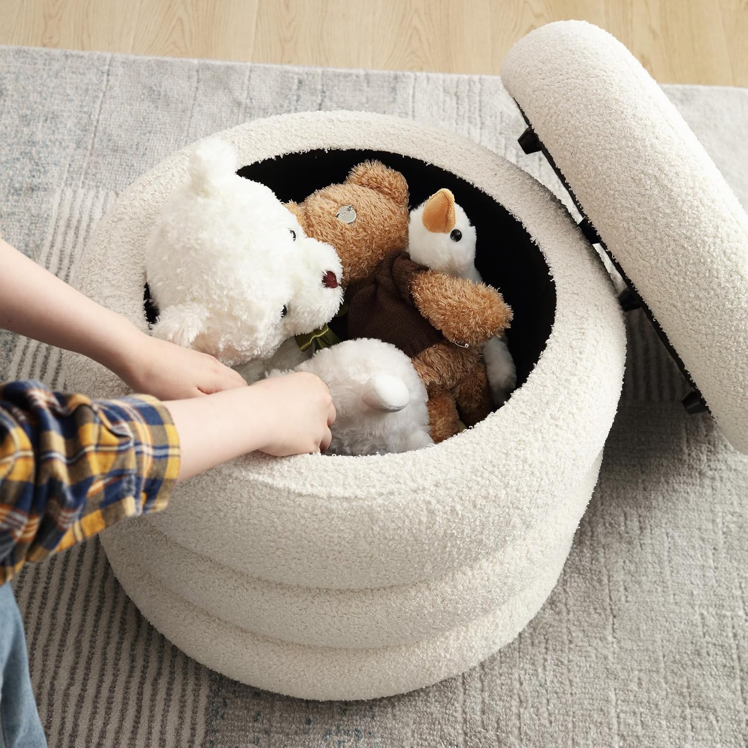 - [Enough Storage Space] A compelling layer of texture is added by the chic, soft boucle fabric, while the ribbed circular form creates a distinctive, modern design. Lifting the detachable lid reveals a storage area where you may arrange and organize all of your favorite things, including books, kid's toys, random objects, and more. You will have a tidy living area with room for all your pillows and blankets to be neatly stored inside.