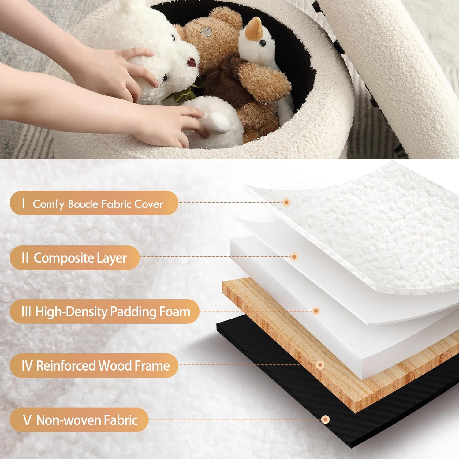 - [Selected Fabric] The Sherpa classic bench's better boucle upholstery makes it cozy to the touch. Comfort and support are provided by a sturdy, produced wooden board and a highdensity foam filling. Your room will look brighter and more inviting with this adorable and cozy storage ottoman stool. Basic, contemporary style is simple and well-groomed.