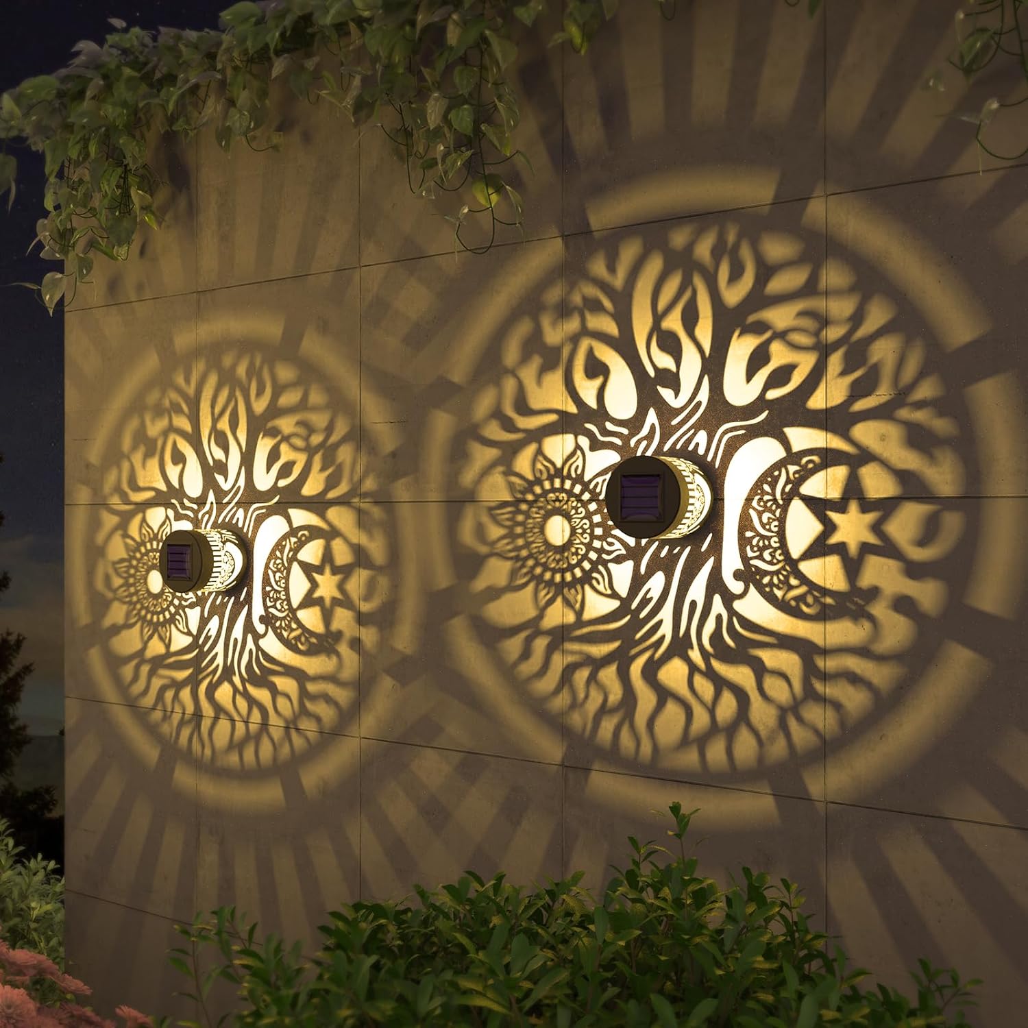 2 Pack Solar Fence Lights Metal Solar Powered Outdoor Wall Deck Step Lights Tree Theme Waterproof Fence Light for Garden Post Patio Backyard Yard Decor (Tree, 2 Pack)