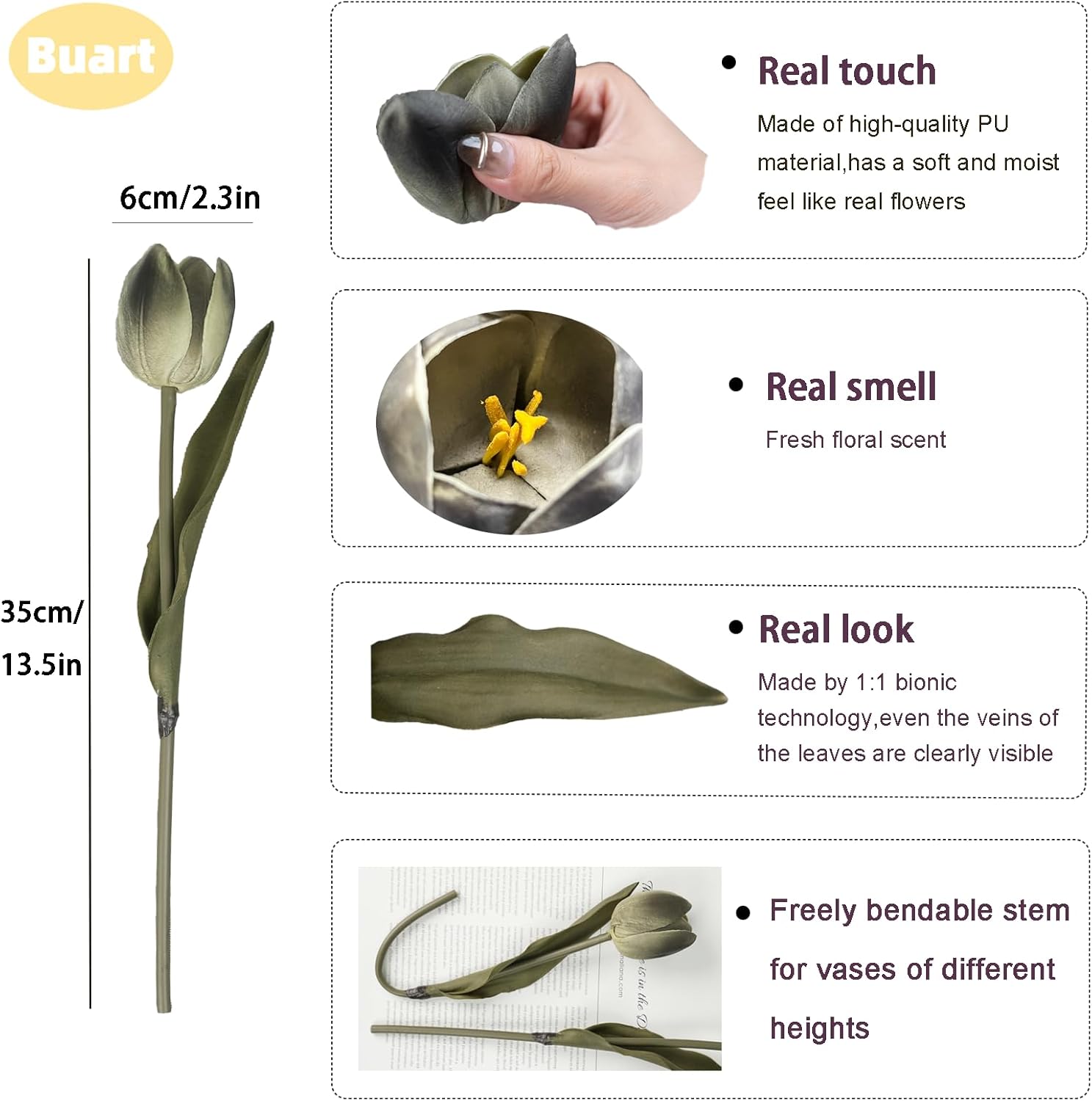 - đ·ăReal Touchă:Made from special PU material,providing a moist touch just like real flowers,they are soft and easy to bend or cut.