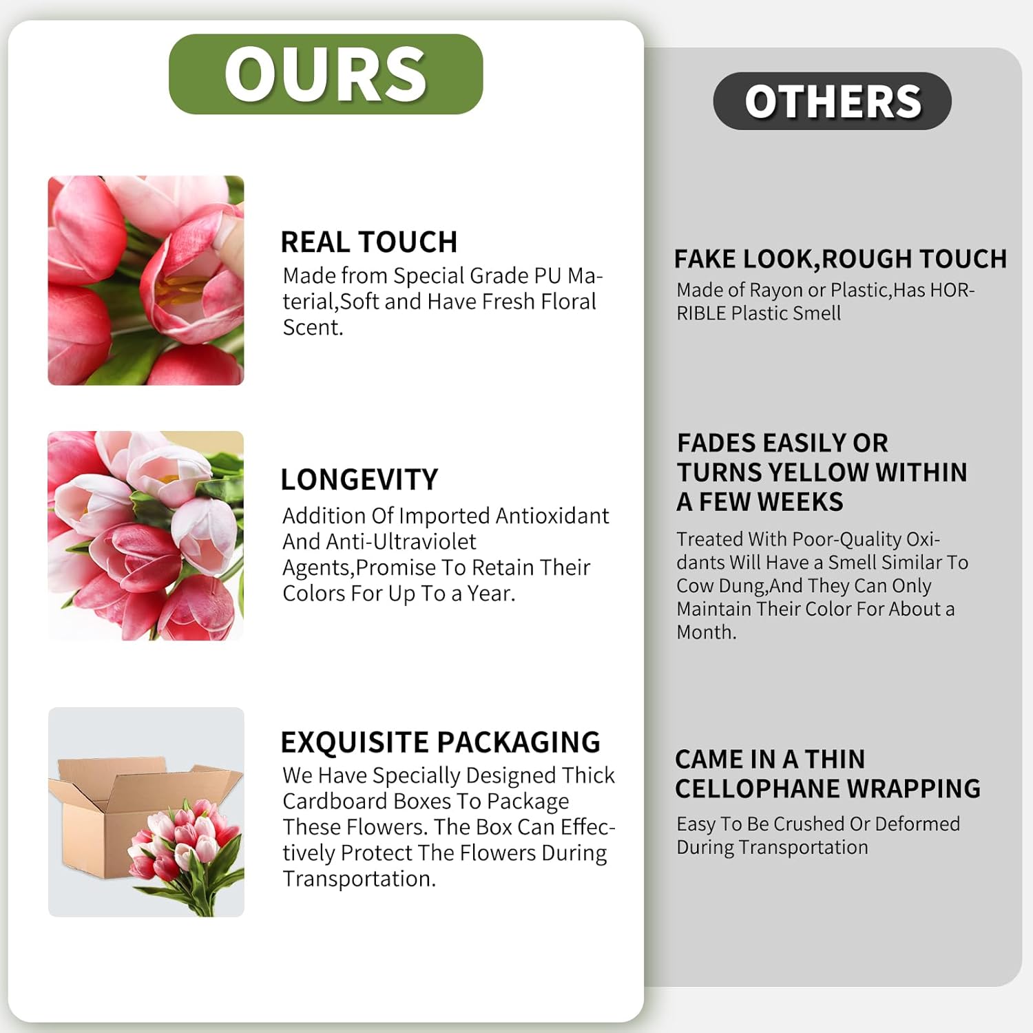 - What sets our tulips apart is their longevity. With the addition of imported antioxidant and anti-ultraviolet agents, these tulips promise to retain their colors for up to a year, ensuring lasting beauty in any environmental condition. Note: Artificial flowers without UV inhibitors will turn yellow within 2 weeks under sunlight, and those treated with poor-quality oxidants will have a smell similar to cow dung or burning plastic , and they can only maintain their color for about a month.
