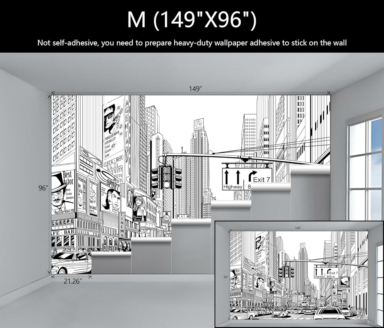 WFBHUA-Black and White New York City Wallpaper Hand Painted Times Square Wall Mural Decoration for Living Room Bedroom Offices(Not Peel and Stick)