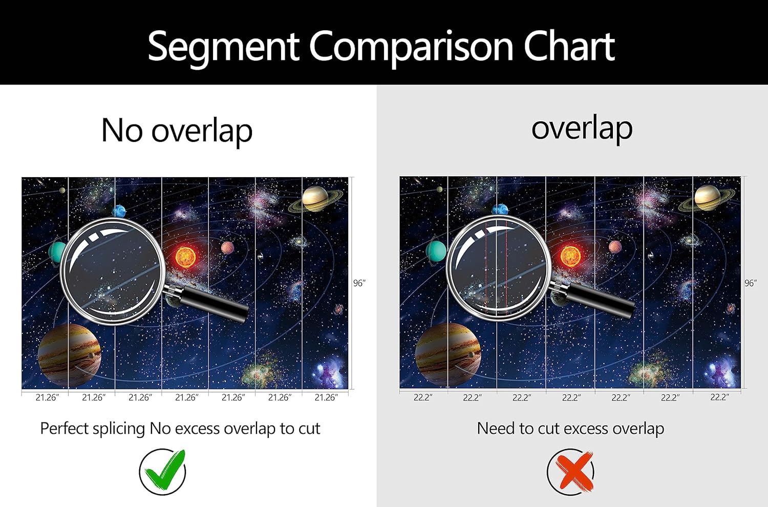 - Mural Size: The total size of this mural wallpaper is 149" x 96" / 378CM x 244CM (W x H), cut into 7 pieces, each measuring 21.26" x 96", for easy installation.