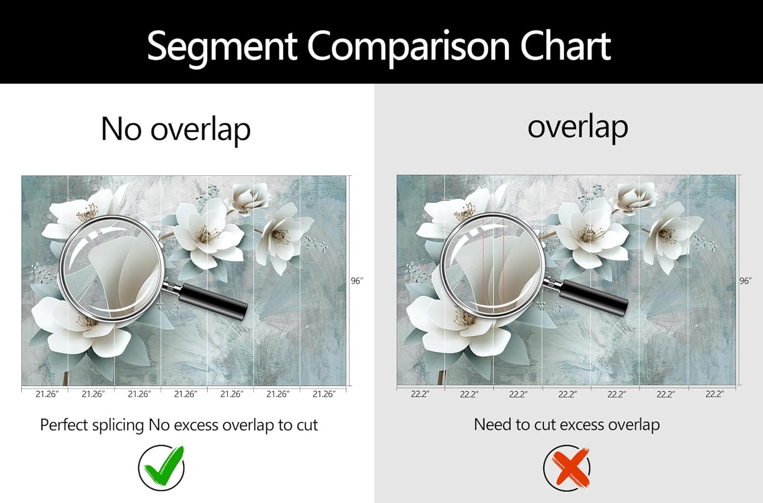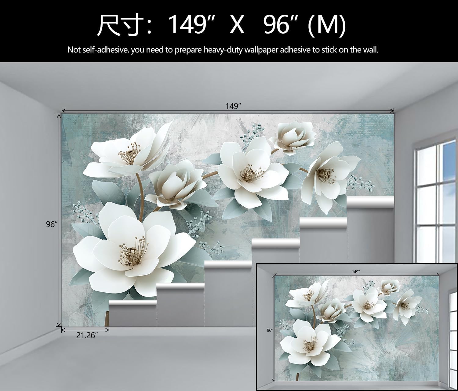 - Mural Size: The total size of this mural wallpaper is 149" x 96" / 378CM x 244CM (W x H), cut into 7 pieces, each measuring 21.26" x 96", for easy installation.