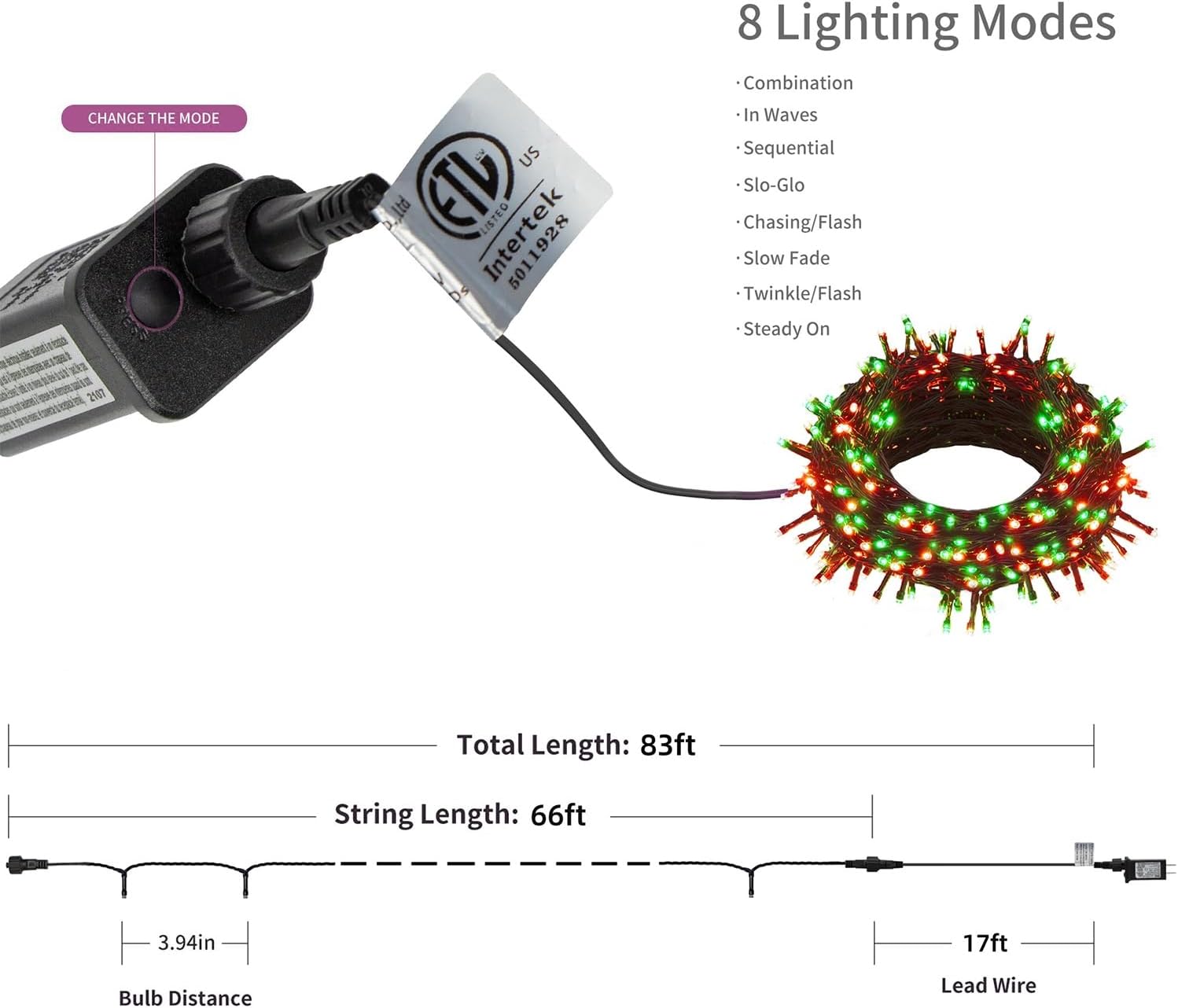 - 8 Lighting Functions with Memory Function: Our Christmas string lights have 8 lighting modes- combination, in waves, sequential, slogs, chasing/flash, slow fade, twinkle/flash, and steady on. Just pressing the round button on the transformer to change the lighting modes. Comes with memory function, will remember last setting automatically after cutting off the power, no need to reset again