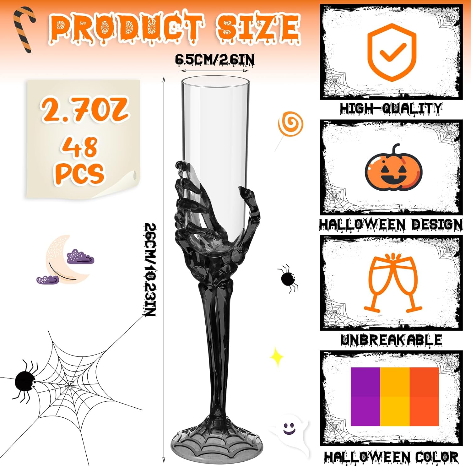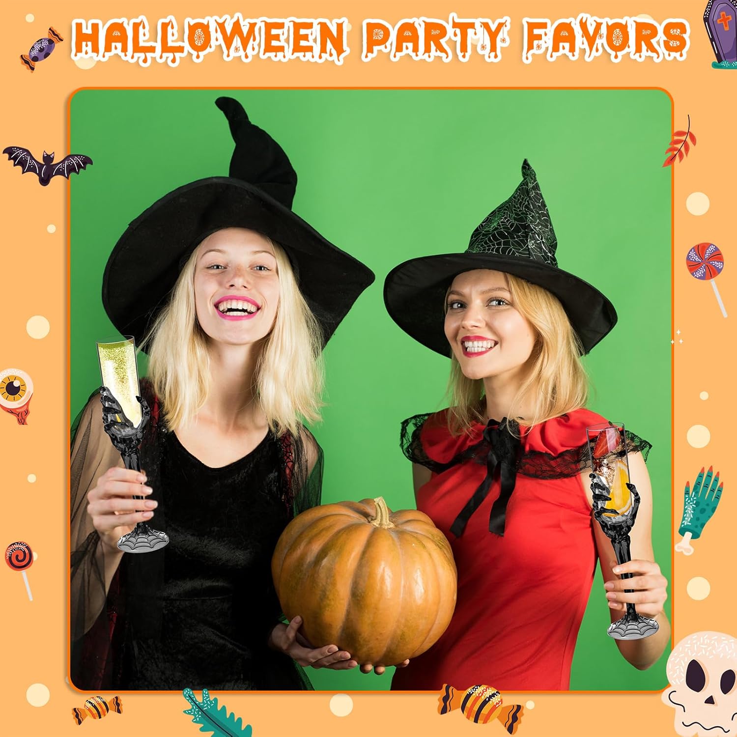 Bokon 48 Pcs Halloween Champagne Flutes Bulk Plastic Stemware Halloween Skeleton Hand Plastic Goblets Creepy Champagne Flute for Party Decoration(Black)