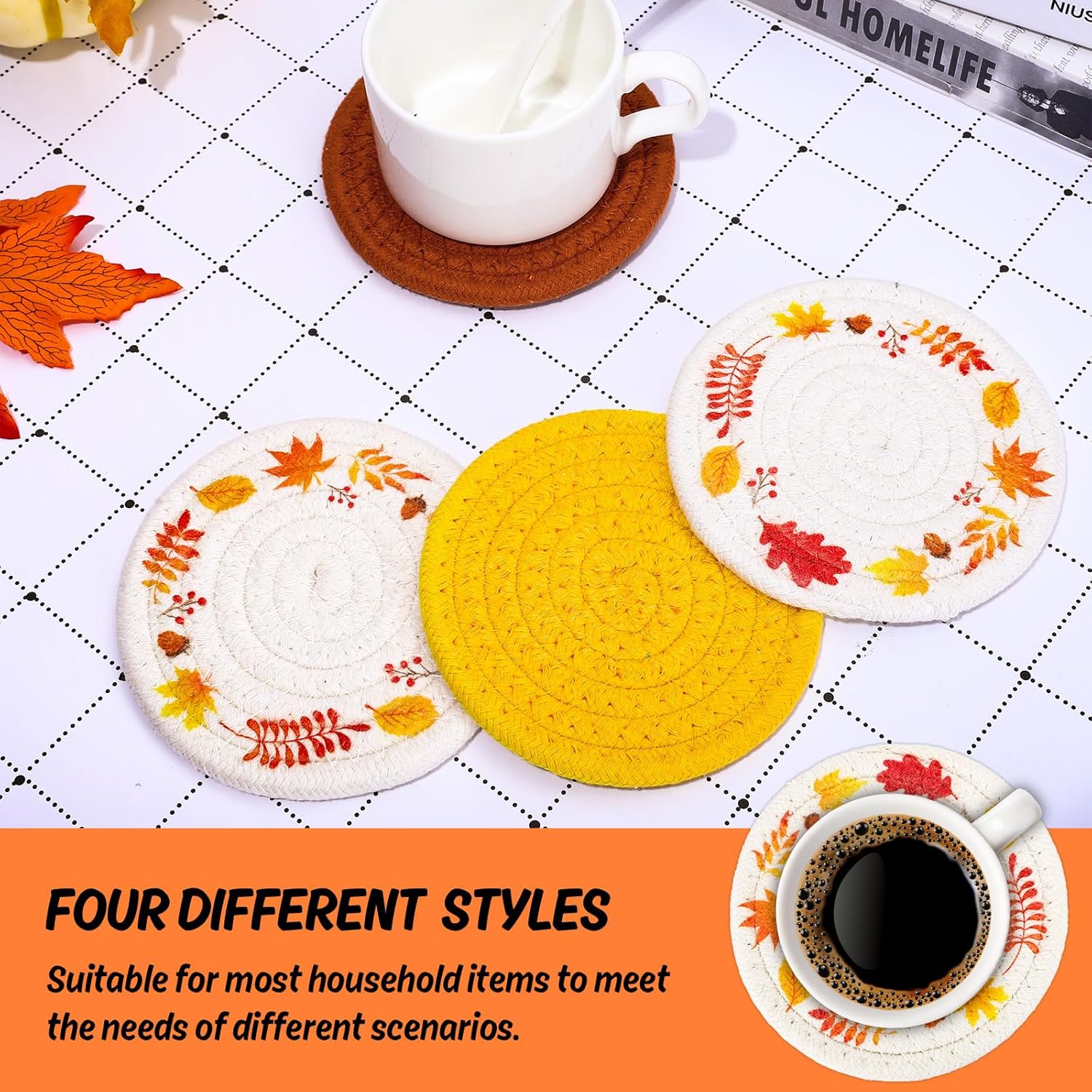 Whaline Fall Coasters Maple Leaves Handmade Braided Cotton Drink Coasters Orange Yellow Non-Slip Absorbent Cup Mats for Autumn Thanksgiving Table Protection Birthday Housewarming Gift Home Decor, 4Pcs