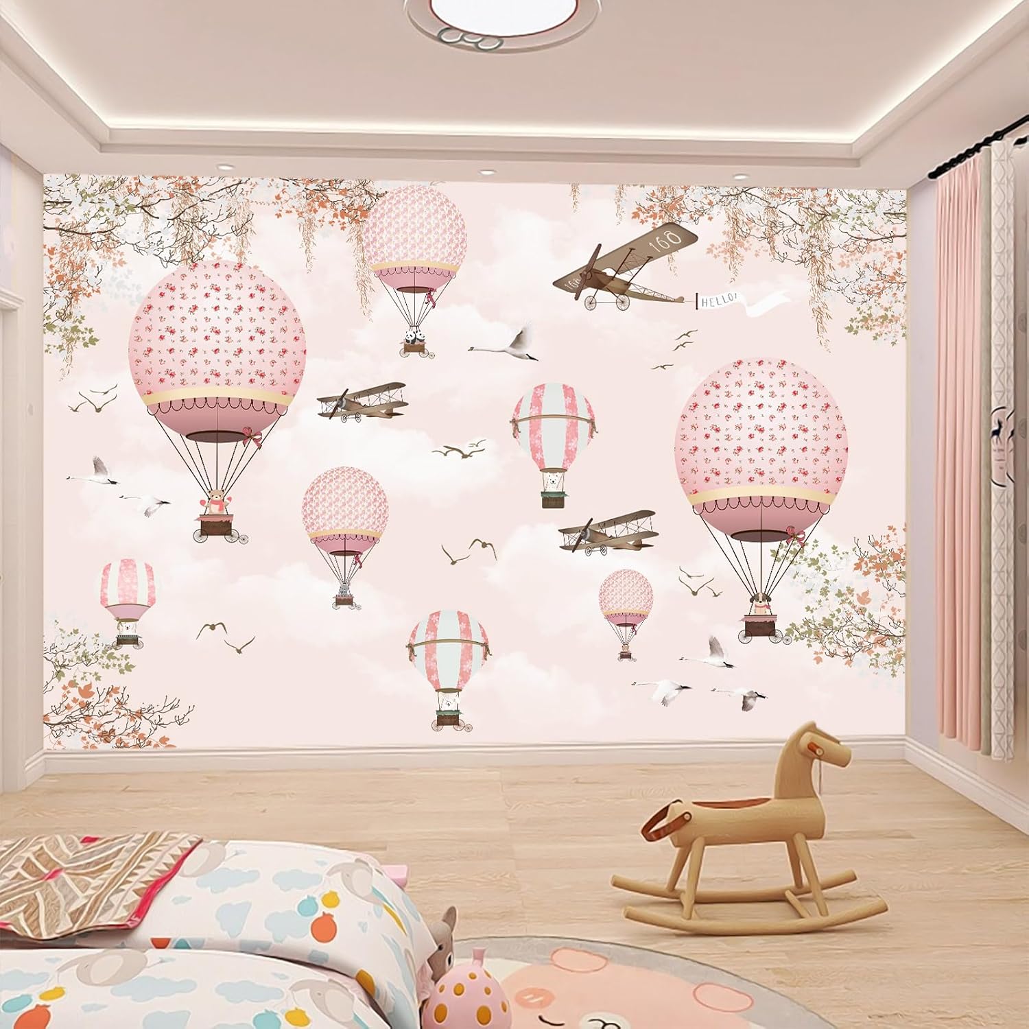 WFBHUA-Hot Air Balloon Wallpaper Mural Cute Animals Airplanes Pink Wallpaper for Nursery Wall Decoration Girls Bedroom Baby Room Kids Room (Not Peel and Stick)