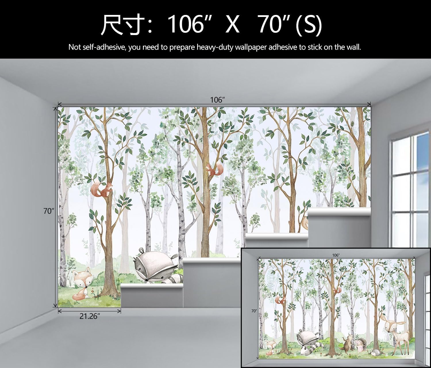 WFBHUA-Kids Wallpaper Watercolor Forest Cartoon Animals Wall Murals Suitable for Nursery Boys Girls Bedroom Room (Not Peel and Stick)