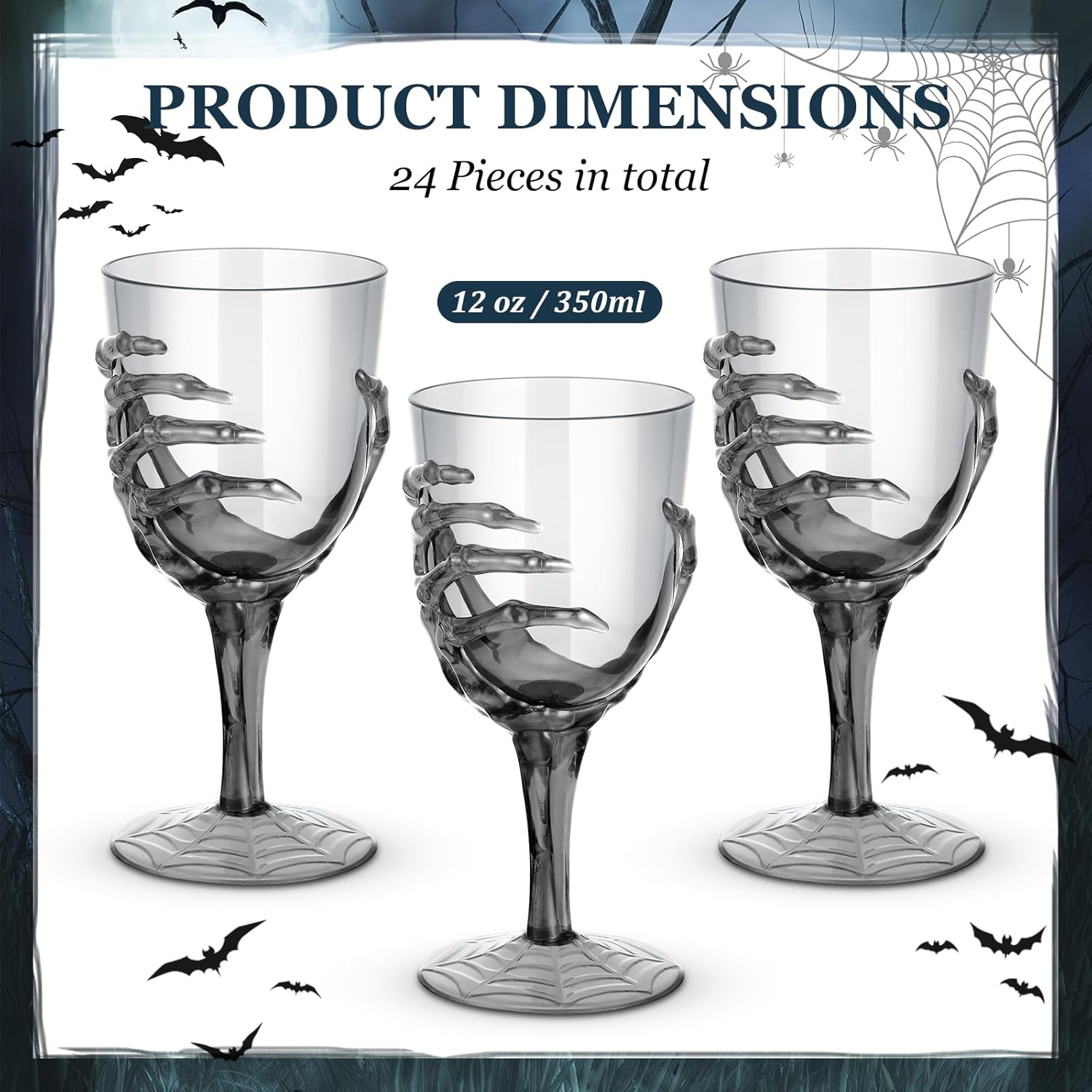 Dandat 24 Pcs Halloween Skeleton Hand Goblets 12oz Clear Plastic Halloween Cups Skull Wine Glass Set for Creepy Spooky Party Decorations (Black)