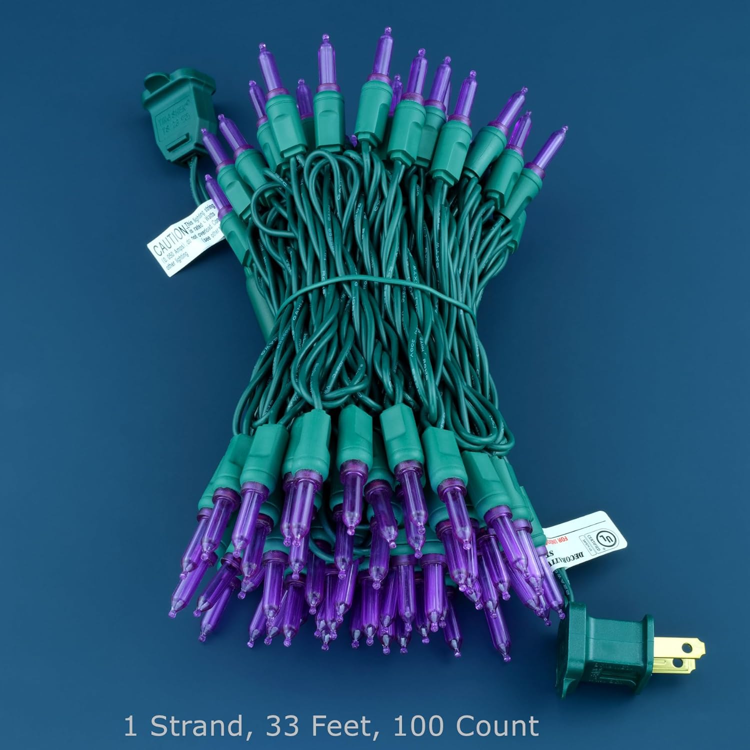 - SPECIFICATIONS ☀ Each pack contains 1 strands of one-piece string lights, total length 33 feet with 100 count purple mini lights. 22 AWG green cord, 4" lead, 4" spacing, 4" tail.