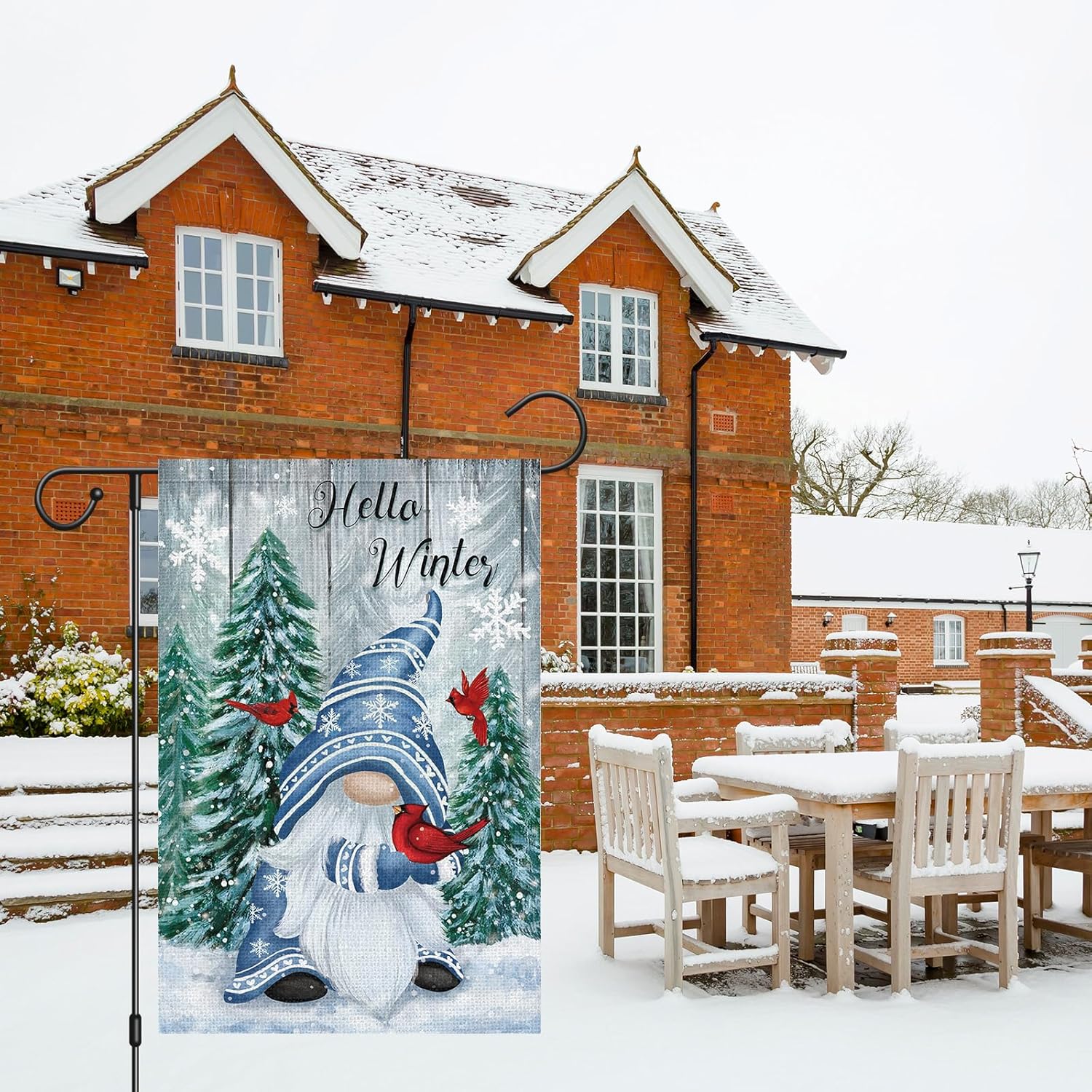 - HELLO WINTER GARDEN FLAG - Our Xmas garden flag is made of premium machine washable burlap, withstand weather characteristic of any season. The Christmas garden flag can be used as a sign or as a gift to friends.