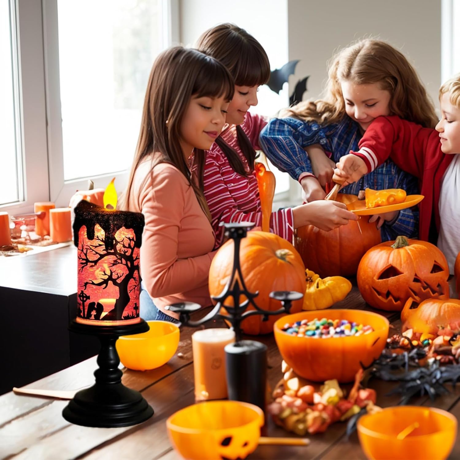 - 【Halloween Decoration Design】it’ s suitable as the Halloween decoration. Unique Halloween ghosts elements. Candle top flame flicker a warm yellow light when you turn on the candle, ,inside water will keep spinning with ghosts decal rotating together, create a spooky atmosphere in your home.