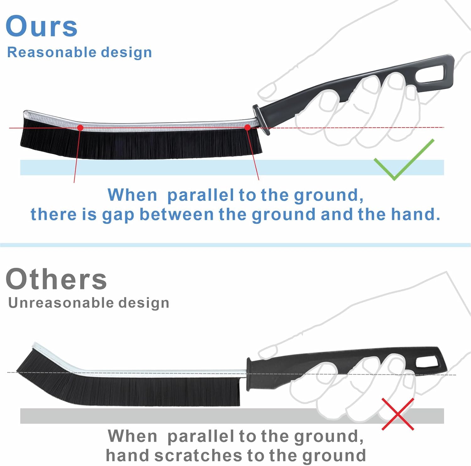- Ergonomic Design: You don‘t have to put in too much effort to get a thorough clean due to the ergonomic design. The robust hard-bristled brush head enables you to scrub away stubborn stains efficiently, they're tough on dirt and grime, yet gentle enough not to damage surfaces. And the 15° angle of the brush head and ergonomic handle allows more fitting to the dead corners and more contact with the ground even the handle parallel to the spot, ensuring maximum cleaning efficiency.