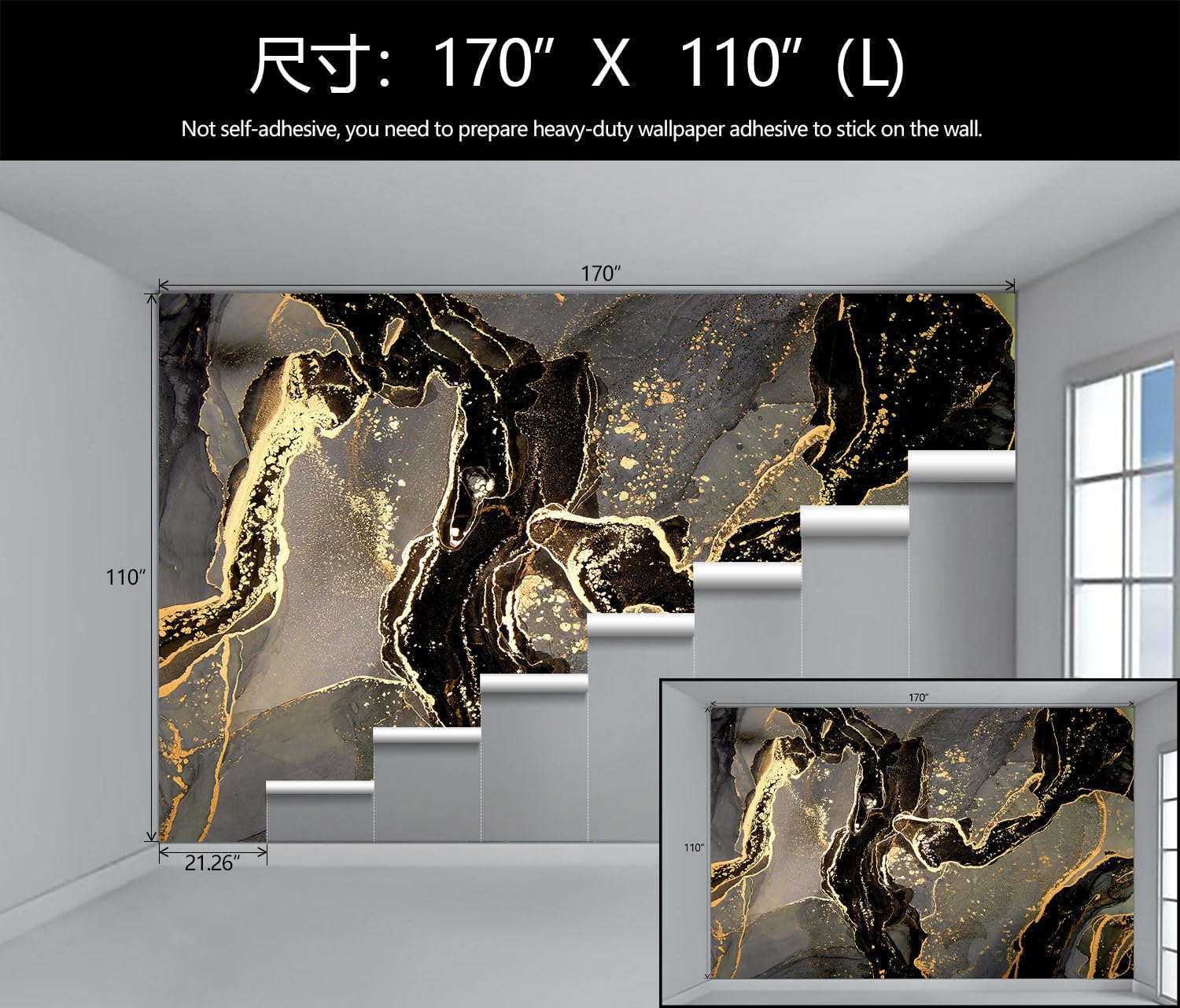 - Mural Size: The total size of this mural wallpaper is 170" x 110" / 432CM x 280CM (W x H), cut into 8 pieces, each measuring 21.26" x 110", for easy installation.