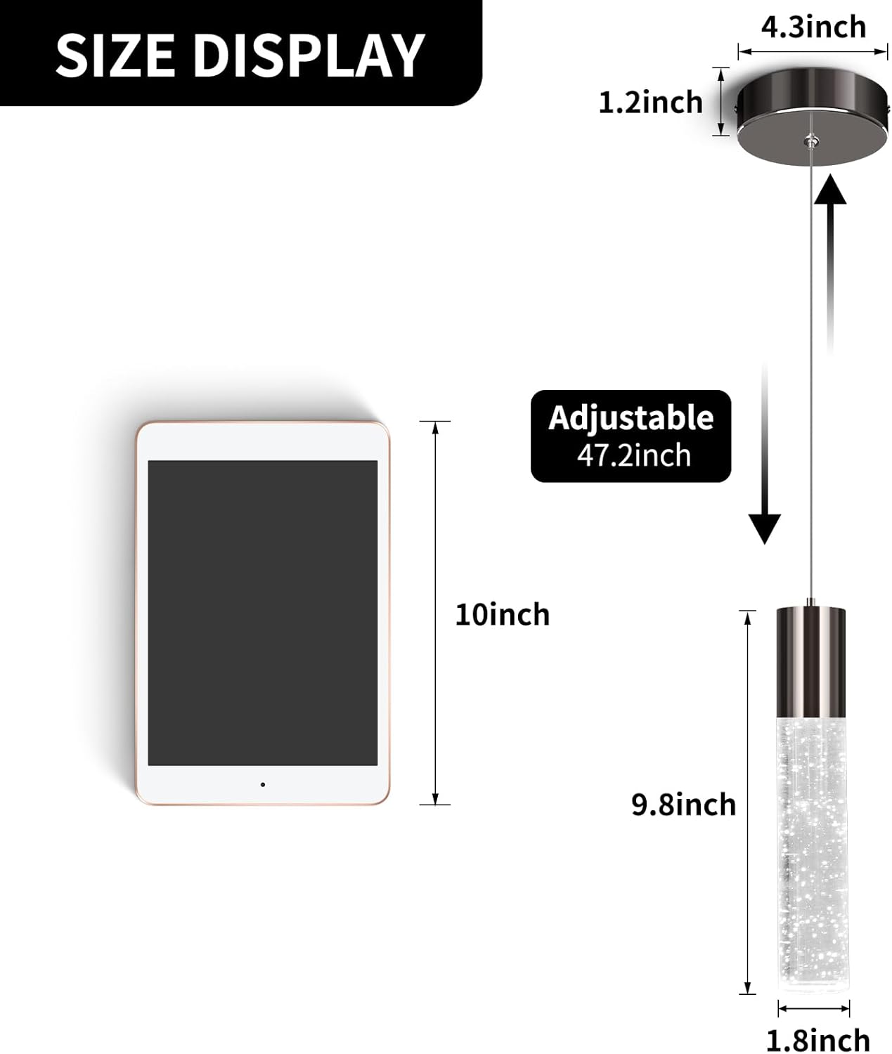 - 【Size and dimmable】: Kitchen island pendant light cylindrical body diameter: 4.6 cm, height: 24.9 cm. The height can be adjusted from 25 cm to 120 cm. Black pendant light fixture with ETL certified dimming driver, the light brightness can be between 10%-100%, but needs to be used with an adapted dimmer.