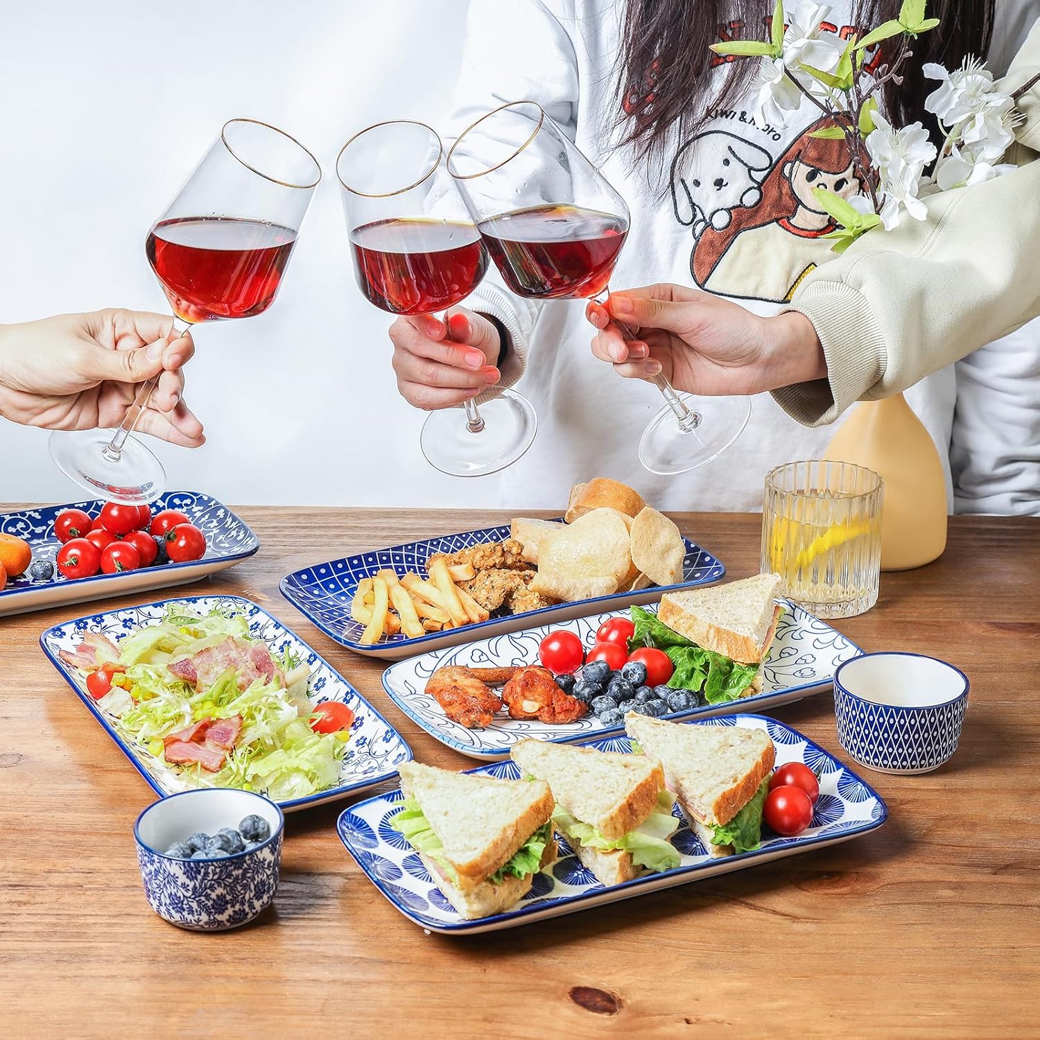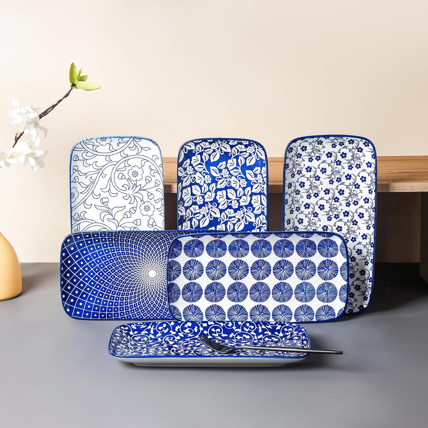 Selamica Ceramic Serving Platters, 12 Inch Serving Trays for Party Entertaining, Large Rectangular Serving Plates for Food, Set of 6, Vintage Blue