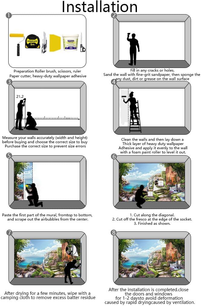 - Installation steps 1. Fill in any cracks or holes and clean the surface of the wall of dust, dirt and grease.2. Apply heavy-duty wallpaper paste to the wall, not the mural.3. Mark the position of each strip of wallpaper with a spirit level.4. Align the pattern and slide it into place.5. Scrape the bubbles with a spatula.6. Let it dry for a couple of minutes and it's ready to go!