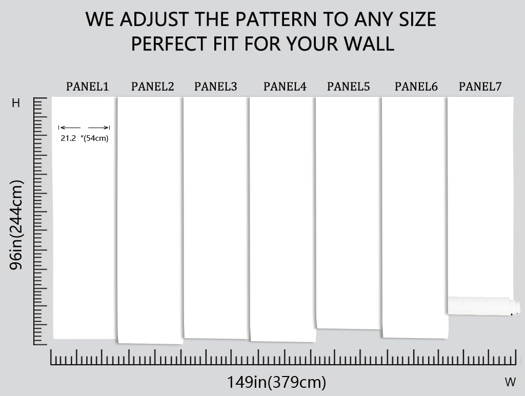 - Our mural is 96 inches tall and 149 inches wide, and to make it easier to transport over long distances, we have divided the width into 7 panels of 21.2 inches each, with a numerical serial number under each section to make installation easier!