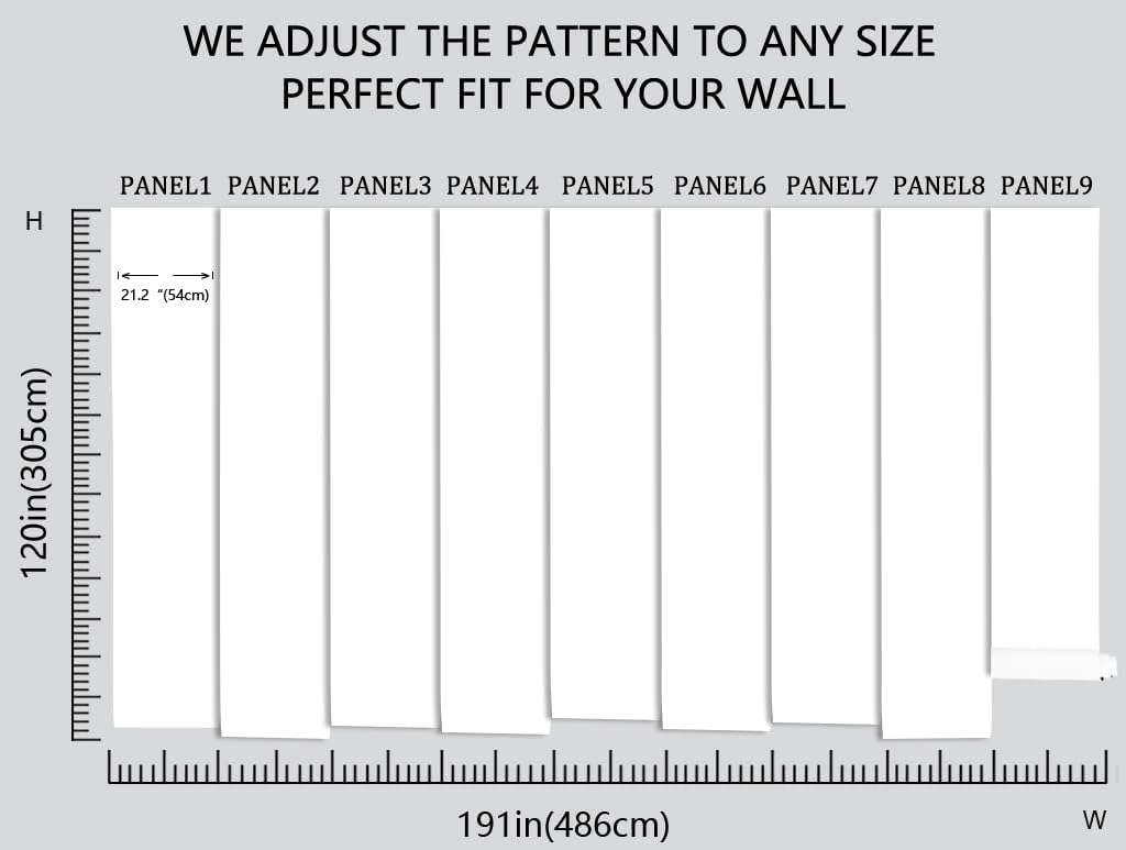 - Our mural is 120 inches tall and 191 inches wide, and to make it easier to transport over long distances, we have divided the width into 9 panels of 21.2 inches each, with a numerical serial number under each section to make installation easier!