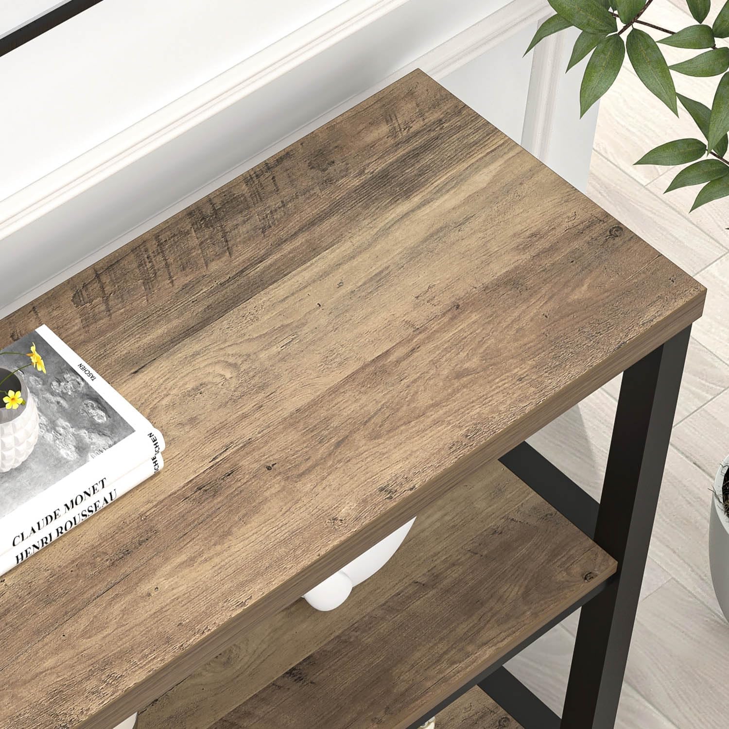 - Modern Entryway Table: The seamless combination of the black metal frame and the rustic oak wood grain surface imparts a sophisticated, modern-industrial ambiance, elevating your space with a harmonious and stylish aesthetic.